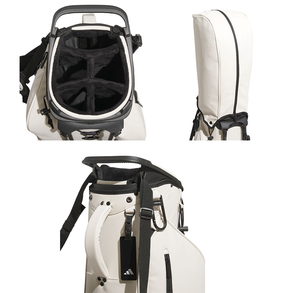 アディゼロコンセプトの小型、軽量スタンドバッグ。口径は7.5インチ、重量2.3kgと持ち運びしやすいサイズ。クラブは14本収納可能。背負えるダブルショルダーストラップ。フロントのファスナーポケットはクレスティングに対応した取り外しタイプ。