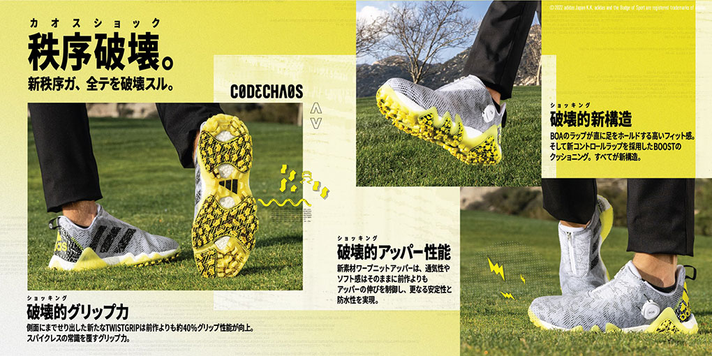 初代コードカオスの先進的なコンセプトはそのままに快適性・スイング時の安定性・グリップ性能といった、ゴルフシューズに求められる性能が前作モデルから大幅に向上し、初のフルモデルチェンジ。