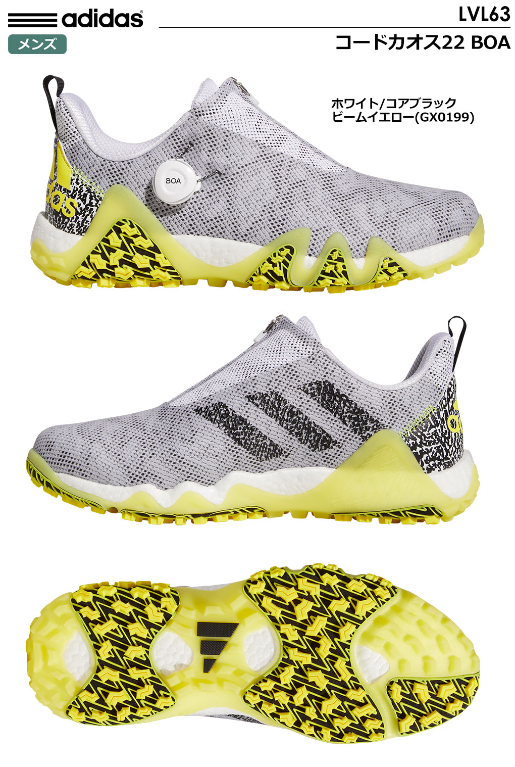 【毎日発送】アディダス ゴルフシューズ コードカオス22 BOA LVL63 メンズ スパイクレスシューズ GX0199 ホワイト/コアブラック/ビームイエロー adidas 2022年モデル 日本正規品