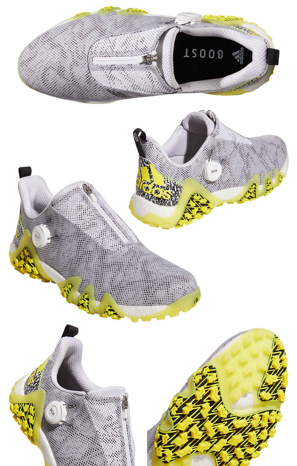 ■『破壊的新構造』 進化したコントロールラップによって歩行時にはBOOSTのクッション性をさらに高め、スイング時にはBOOSTの適所の安定性と反発力を強化。従来BOAシューズには無い、BOAラップがシューズの内部で足を直にホールドする「直足BOAラップ」という革新的な新構造によって未体験のフィット感と安定性を実現。加えてファスナーを上げ下げすることで安定性か快適性のどちらかを優先できる性能のモード切り替えも可能。