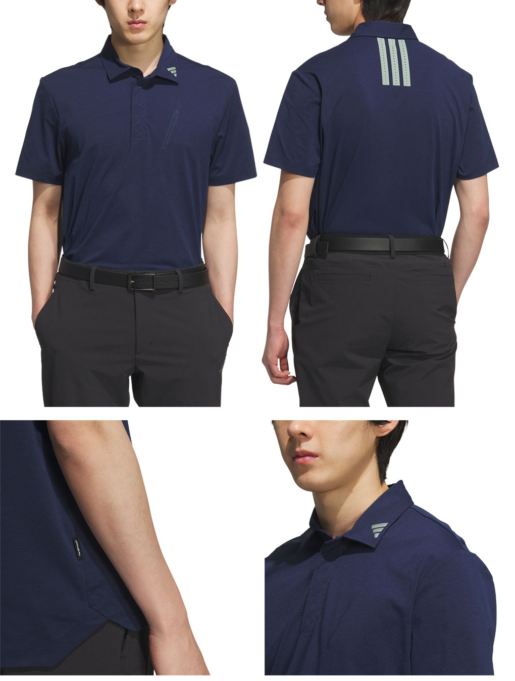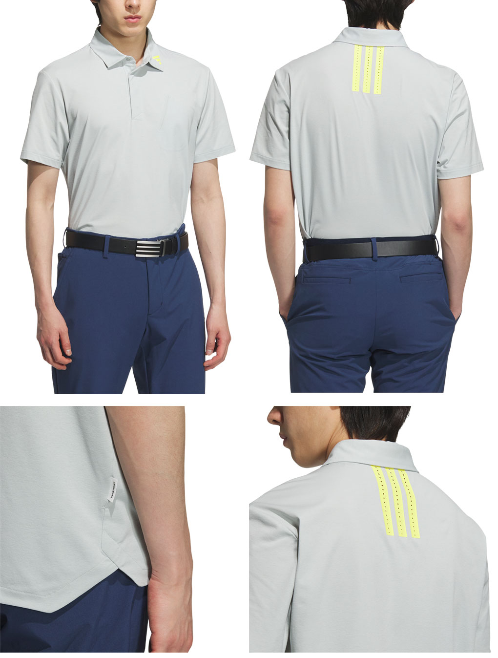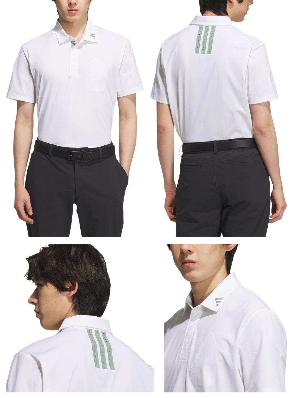 軽量かつ動きに制限がかからない快適なストレッチ性のあるツイストニット素材を使用したポロシャツ。後見頃のスリーストライプにピンホール型ベンチレーションが採用されており通気性の高い商品。