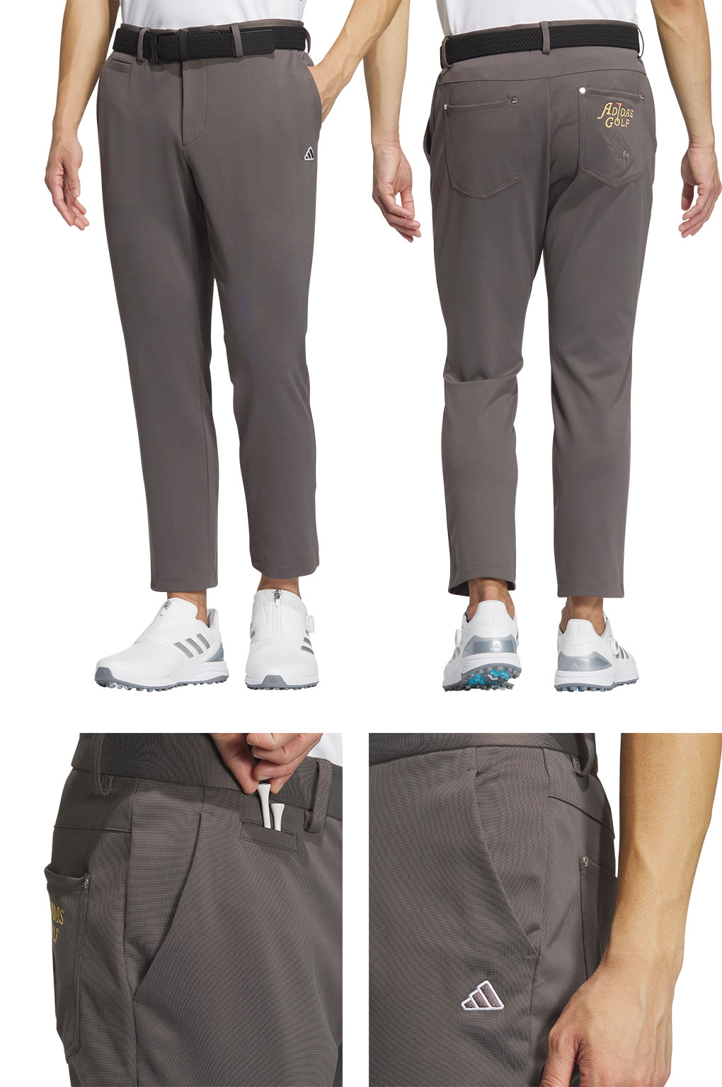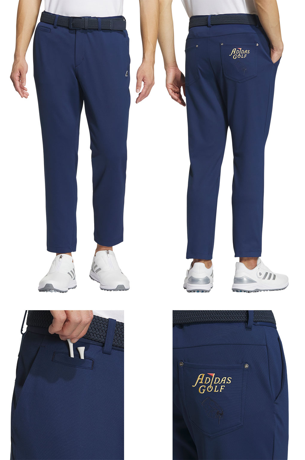 スタンダードな5ポケットパンツは後ろパッチポケットのゴルフモチーフ刺繍がポイントです。