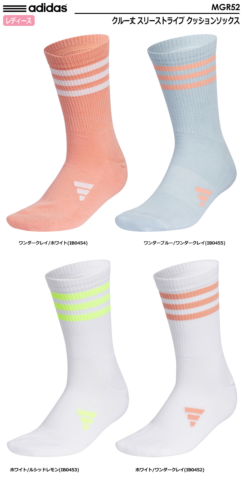【毎日発送】アディダス クルー丈 スリーストライプ クッションソックス MGR52 レディース adidas 2023秋冬モデル 日本正規品