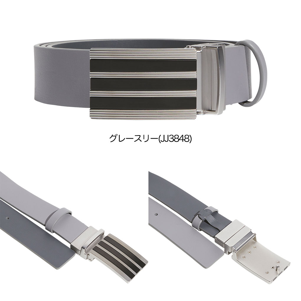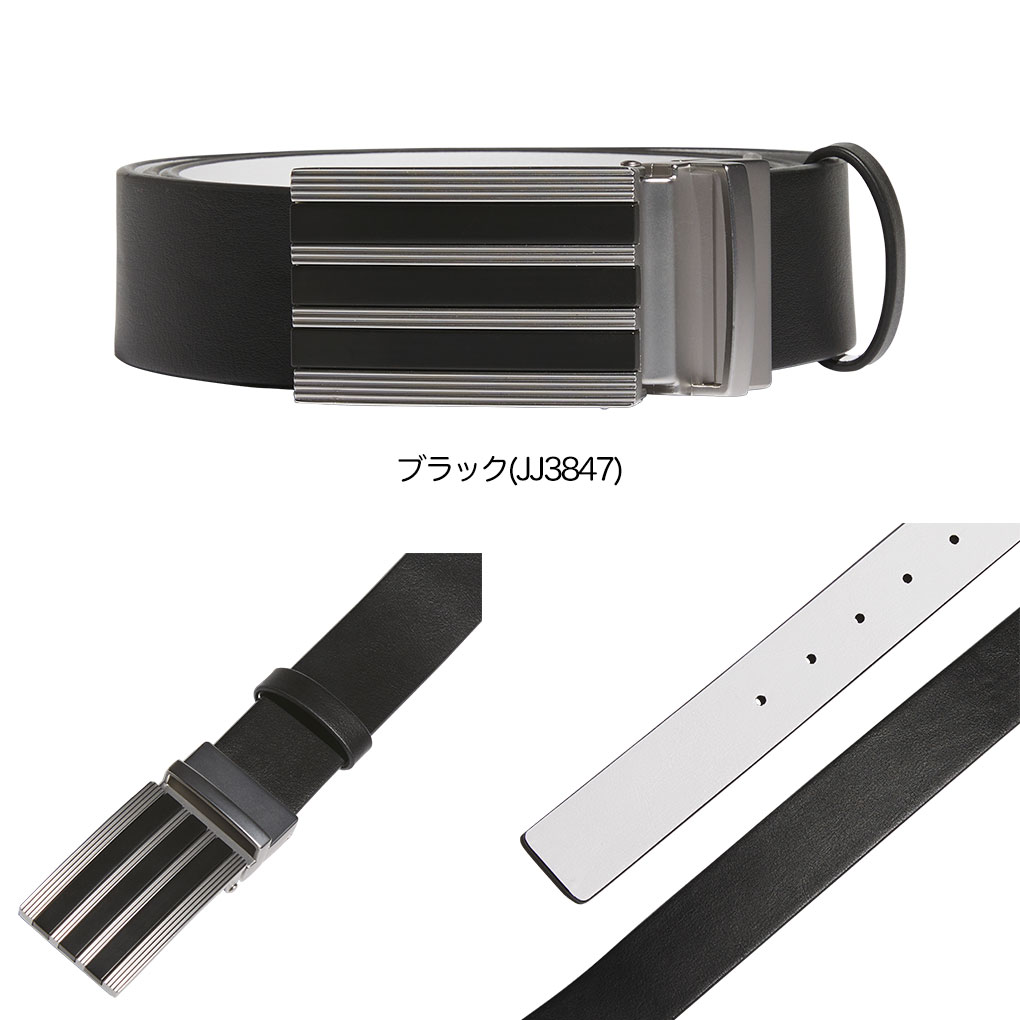 スリーストライプスデザインのメタリックバックル。リバーシブルで好みの色を選択できる。長さを調節できるカッタブルベルト。