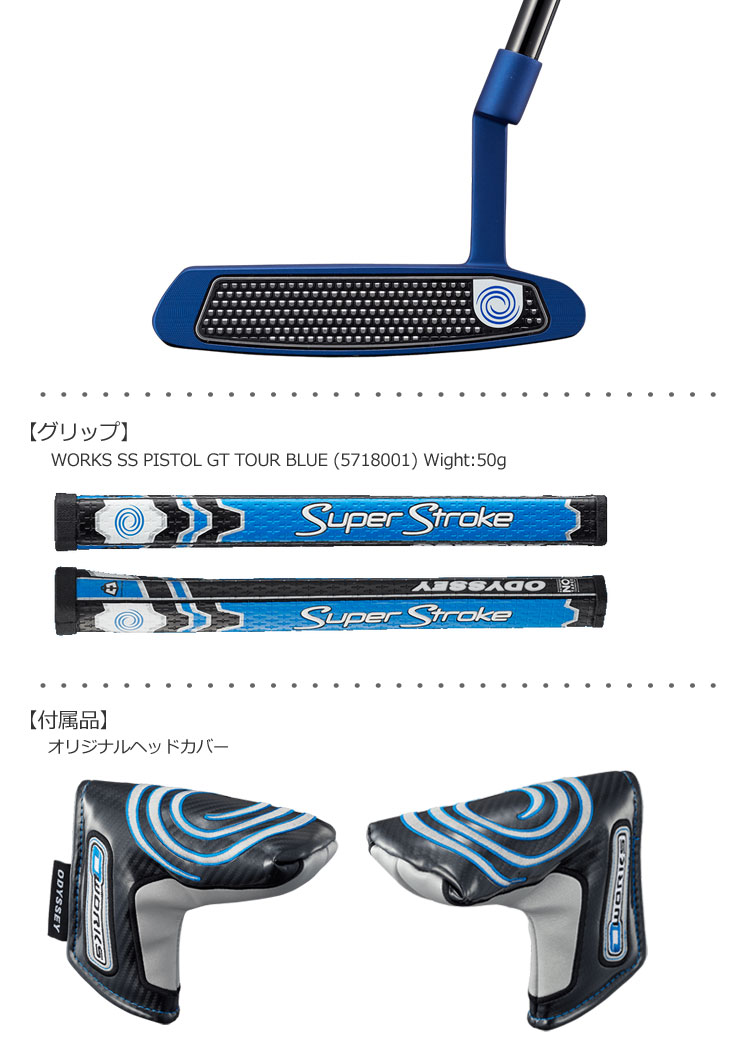 グリーン上で映える鮮やかな青を採用した「O-WORKS BLUEパター」。グリップ、ヘッドカバーもヘッドに合わせたカラーを採用しています。