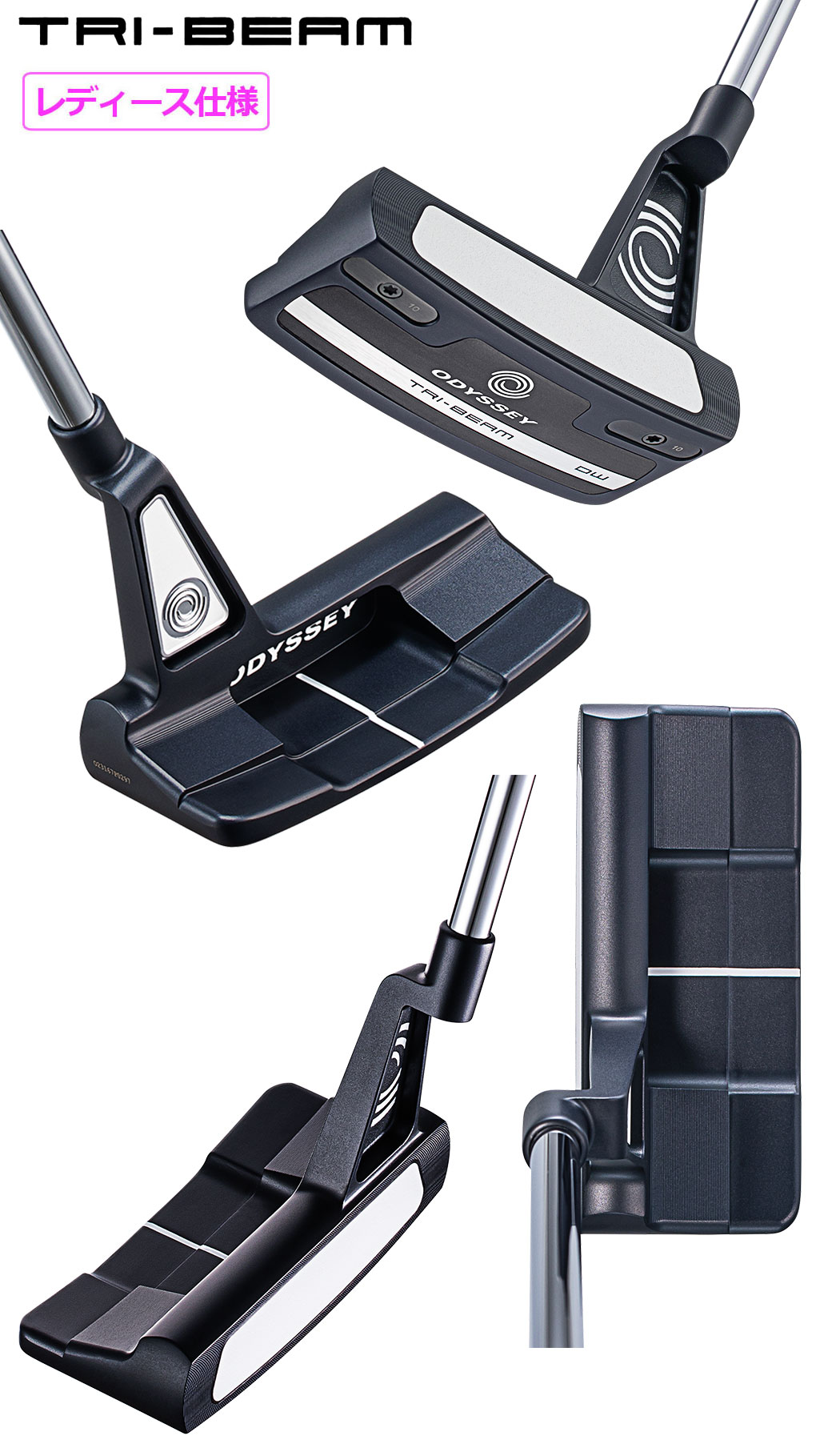 今回、「TRI-BEAM ウィメンズパター」でラインアップされたのは、コンベンショナルなブレードタイプの「#1」、幅広いブレードタイプの「DOUBLE WIDE」、「DOUBLE WIDE」をセンターシャフト仕様にした「DOUBLE WIDE CS」、人気の高いツノ型の「#7」、WHITE HOT VERSAパターで登場した新しい形状のマレットである「TWELVE」です。いずれのヘッドにも、従来のネイビー×レッドとは違い、専用カラーのネイビーとホワイトが採用されており、付属するヘッドカバーも同じ2色で彩られています。また、STROKE LABシャフトのカーボン部分はホワイト地にネイビーの文字、グリップには淡いラベンダー色にホワイトの文字と、こちらもウィメンズバージョン専用カラーリングとなっています。パター長さは、32インチです。