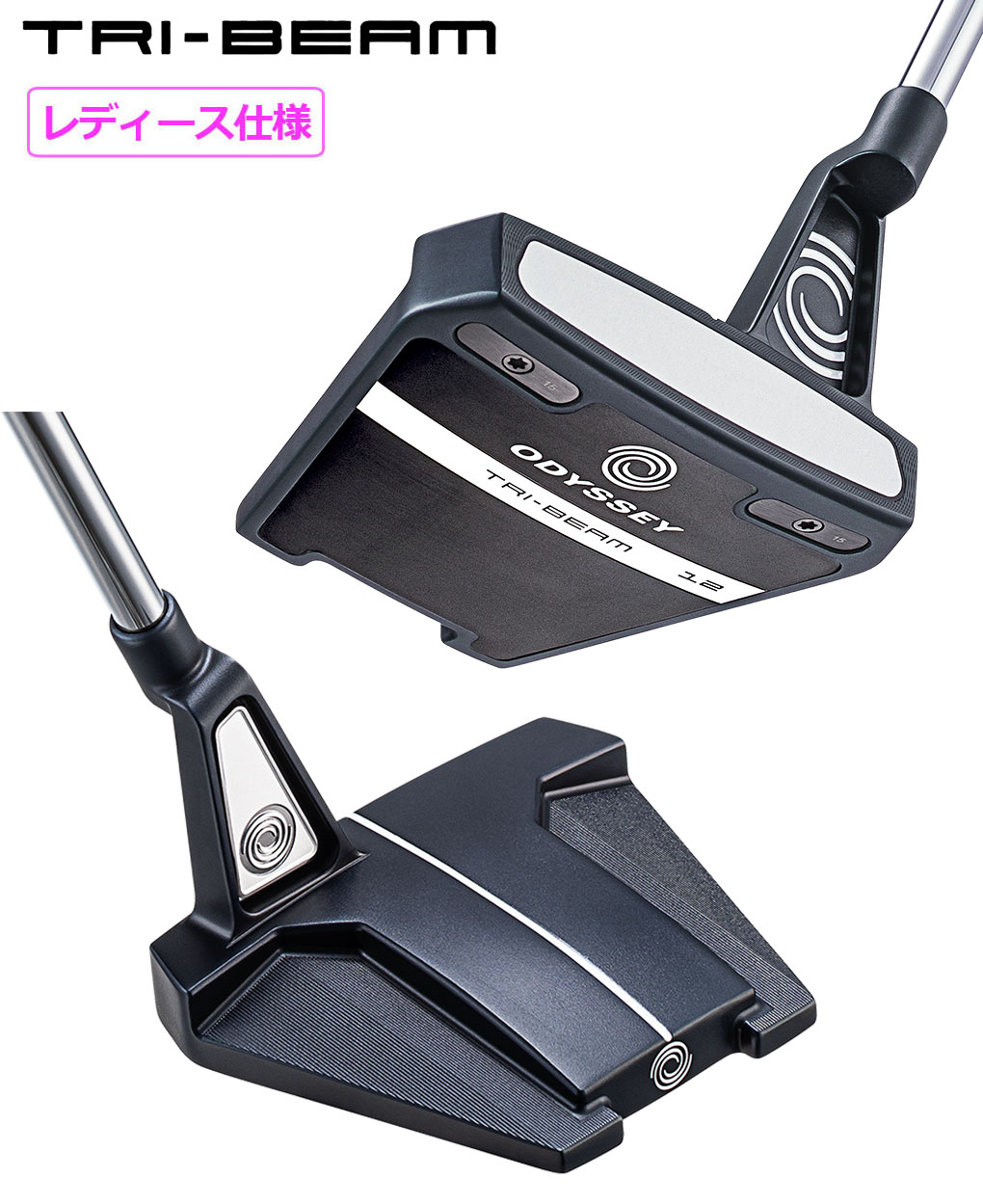 今回、「TRI-BEAM ウィメンズパター」でラインアップされたのは、コンベンショナルなブレードタイプの「#1」、幅広いブレードタイプの「DOUBLE WIDE」、「DOUBLE WIDE」をセンターシャフト仕様にした「DOUBLE WIDE CS」、人気の高いツノ型の「#7」、WHITE HOT VERSAパターで登場した新しい形状のマレットである「TWELVE」です。いずれのヘッドにも、従来のネイビー×レッドとは違い、専用カラーのネイビーとホワイトが採用されており、付属するヘッドカバーも同じ2色で彩られています。また、STROKE LABシャフトのカーボン部分はホワイト地にネイビーの文字、グリップには淡いラベンダー色にホワイトの文字と、こちらもウィメンズバージョン専用カラーリングとなっています。パター長さは、32インチです。