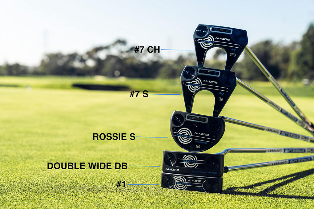 AIインサートを搭載するボディは、ステンレススチール製となっており、ヘッド仕上げは濃紺のPVDとなっています。また、慣性モーメントを高めるべく、ソールのトウ・ヒールには、それぞれ約15gのスクリューウェイトが設置されています。「Ai-ONEパター」のラインアップは、全部で5種類。ブレードの「#1」、幅の広いブレードでネックがダブルベントの「DOUBLE WIDE DB」、マレットのヘッドにショートスラントネックを組み合わせた「ROSSIE S」、ツノ型のヘッドにショートスラントネックの「#7 S」、ツノ型のヘッドにクランクホーゼルの「#7 CH」という顔ぶれです。