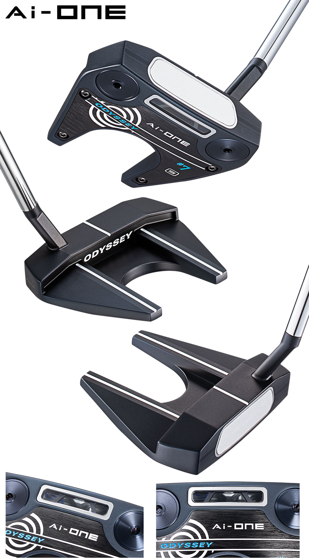 AIインサートを搭載するボディは、ステンレススチール製となっており、ヘッド仕上げは濃紺のPVDとなっています。また、慣性モーメントを高めるべく、ソールのトウ・ヒールには、それぞれ約15gのスクリューウェイトが設置されています。「Ai-ONEパター」のラインアップは、全部で5種類。ブレードの「#1」、幅の広いブレードでネックがダブルベントの「DOUBLE WIDE DB」、マレットのヘッドにショートスラントネックを組み合わせた「ROSSIE S」、ツノ型のヘッドにショートスラントネックの「#7 S」、ツノ型のヘッドにクランクホーゼルの「#7 CH」という顔ぶれです。
