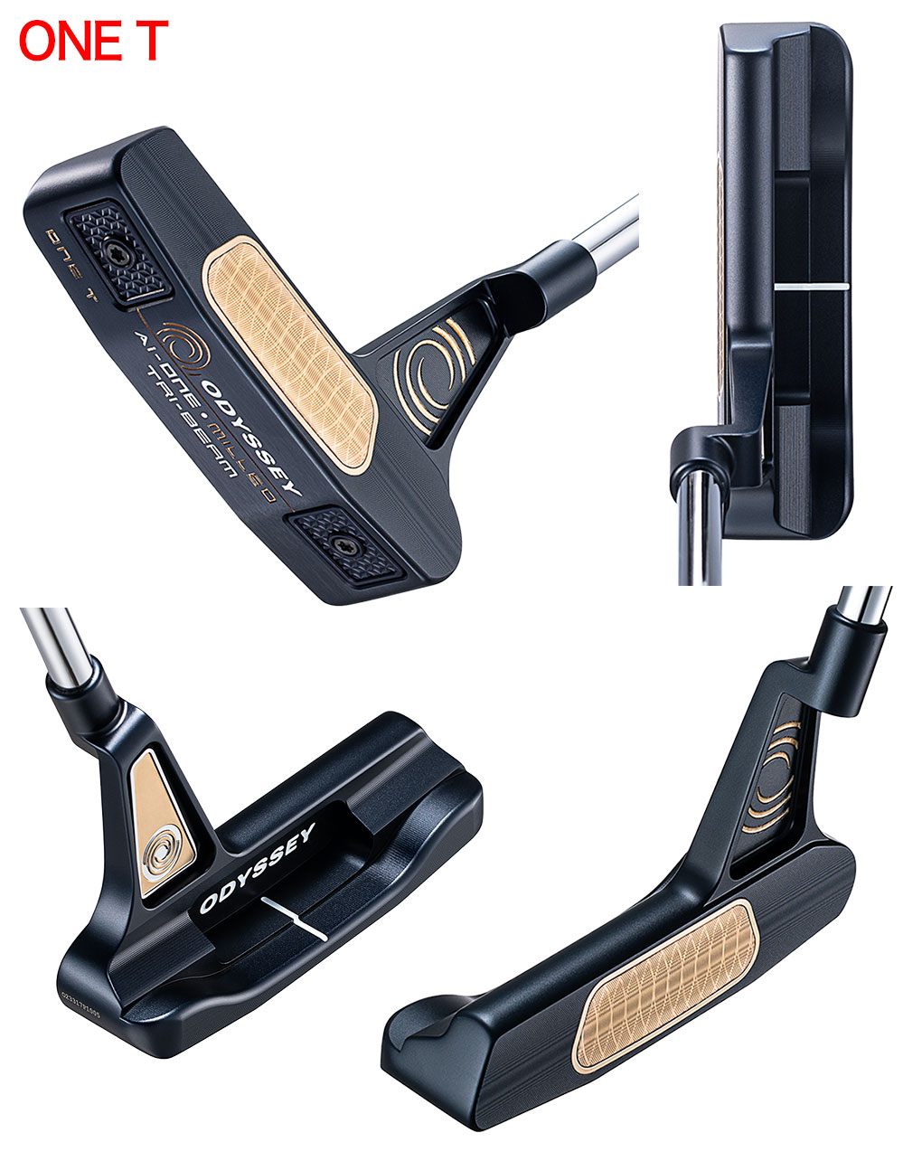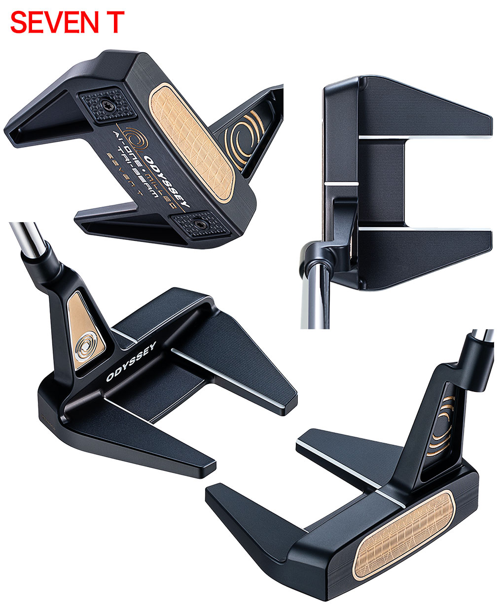 Ai-ONE MILLED TRI-BEAMパター」には全5種類のモデルが用意されました。ブレードの「ONE T」、幅の広いブレードの「DOUBLE WIDE T」と、そのセンターシャフトタイプである「DOUBLE WIDE T CS」、ヘッドの前後長がやや長めのマレットである「SIX T」、そして、人気が高いツノ型形状の「SEVEN T」というラインアップです。なお、名称についている「T」は、フェースインサートの素材に使用されているチタン(Titanium)のTを表しています。