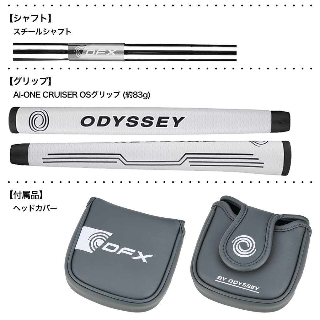 2021年に復活したDFXパターが、「DFX BY ODYSSEYパター」という新たな名称とともに4年ぶりのリニューアルとなりました。オデッセイでもっともソフトなフィーリングは、前作からそのまま踏襲。一方で、ステンレススチール製ボディの色を黒からチャコールグレーへと変更したことにより、精悍なブラックカラーのインサートが、より際立って映るようになりました。ヘッドタイプは、#1 CH、#1W CH、V-LINE FANG DB、#10 S、2-BALL BLADE CHの5機種。すべてにおいて、約76gのDFX Pistolグリップを装着した33、34インチのパター長さを用意しつつ、5つのうちの2つのモデルでは、より女性ゴルファーにフィットするよう、約60gで細めのDFX SLIM Pistolグリップを採用した32インチもラインアップしています。価格はすべて、お求めやすいリーズナブルな設定となっており、スキルレベルを問わず、幅広く使用していただけます。