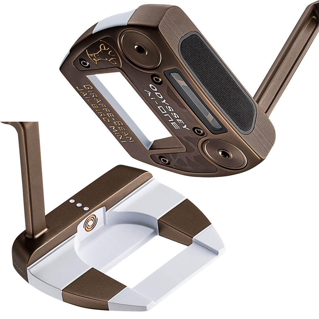 「Ai-ONE GIRAFFE-BEAMパター」は前作のGIRAFFE-BEAMパター同様、随所にキリンをイメージさせるデザインが施されているところも注目に値します。ロゴにはキリンのイラストを採用し、ボディの大部分にはキリンの身体の色に近いカッパー仕上げを導入。ソールにはレーザーでキリンの柄を描き、グリップには前作と違うODYSSEYロゴ、ヘッドカバーには今回贅沢にも刺によってキリンの模様が施されています。ソール前方のトウとヒールには、それぞれ約10gのウェイト(#2のみ約15g)も搭載。ヘッドラインアップには#2、DW、#7、JAILBIRD MINIの4種類が用意されており、いずれにも、すべてスチールでできているSTROKE LAB 90シャフトが組み合わされています。