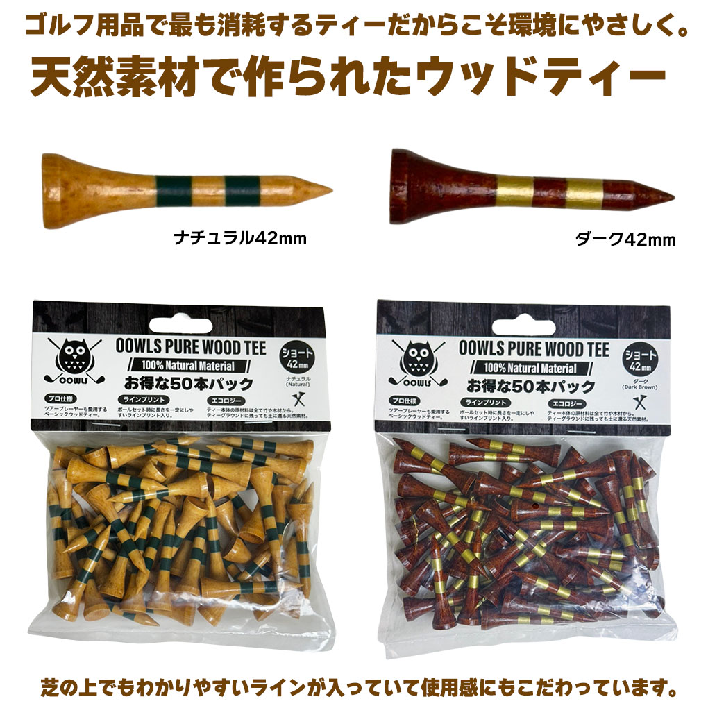 OOWLS ゴルフ ティー PURE WOOD TEE ピュア ウッドティー ショート 42mm 50本入 JYPHB23WDT ゴルフ用品