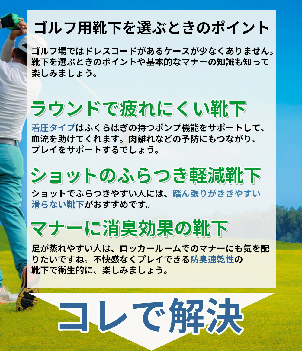 伸縮性に優れた素材と足裏すべり止めにより快適な履き心地とスイング時のグリップ力を実現。