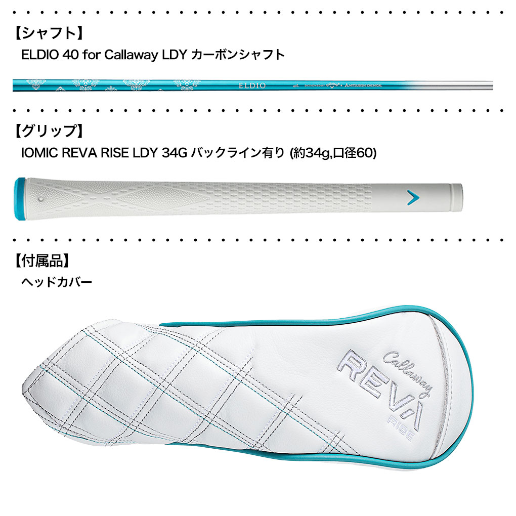 「REVA RISEフェアウェイウッド」ではW#3にのみ、ロフト角やライ角を自分に合うように調整することのできるアジャスタブルホーゼルを、女性シリーズのフェアウェイウッドでは、初めて採用しています。シャフトは、40g台の軽量モデルであるELDIO 40 for CallawayのLフレックスで展開となります。