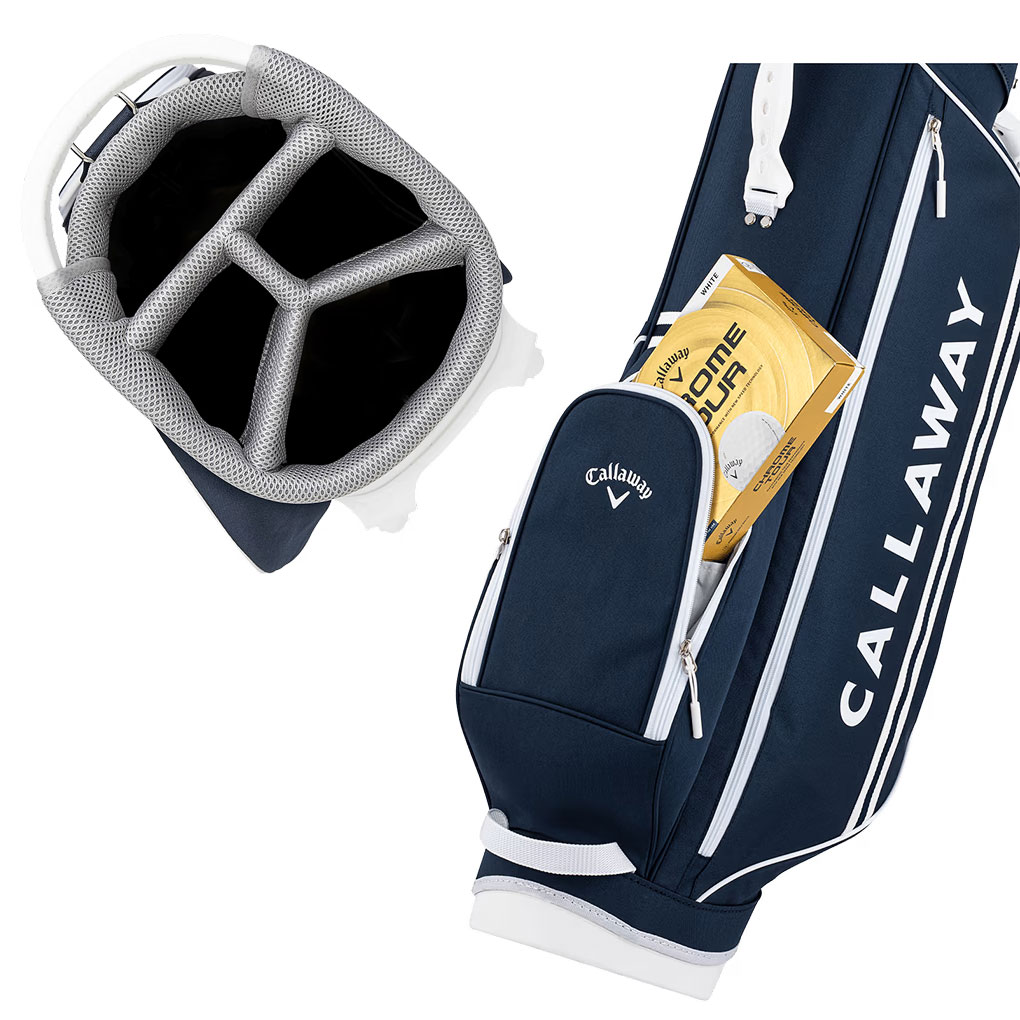 重さはわずか2.5kgの軽量設計。口枠はハンドル付きの8.5型。クラブを整理しやすい5分割仕様。ポケットは合計4個。前ポケットはダース箱がしっかり入るサイズのポケットとサブポケットの2個。右サイドは、かさばるアイテムが収納できる大容量のポケット。左サイドは、ミドルサイズのポケットとサイズの違うポケットを組み合わせた使い勝手のよい設計。