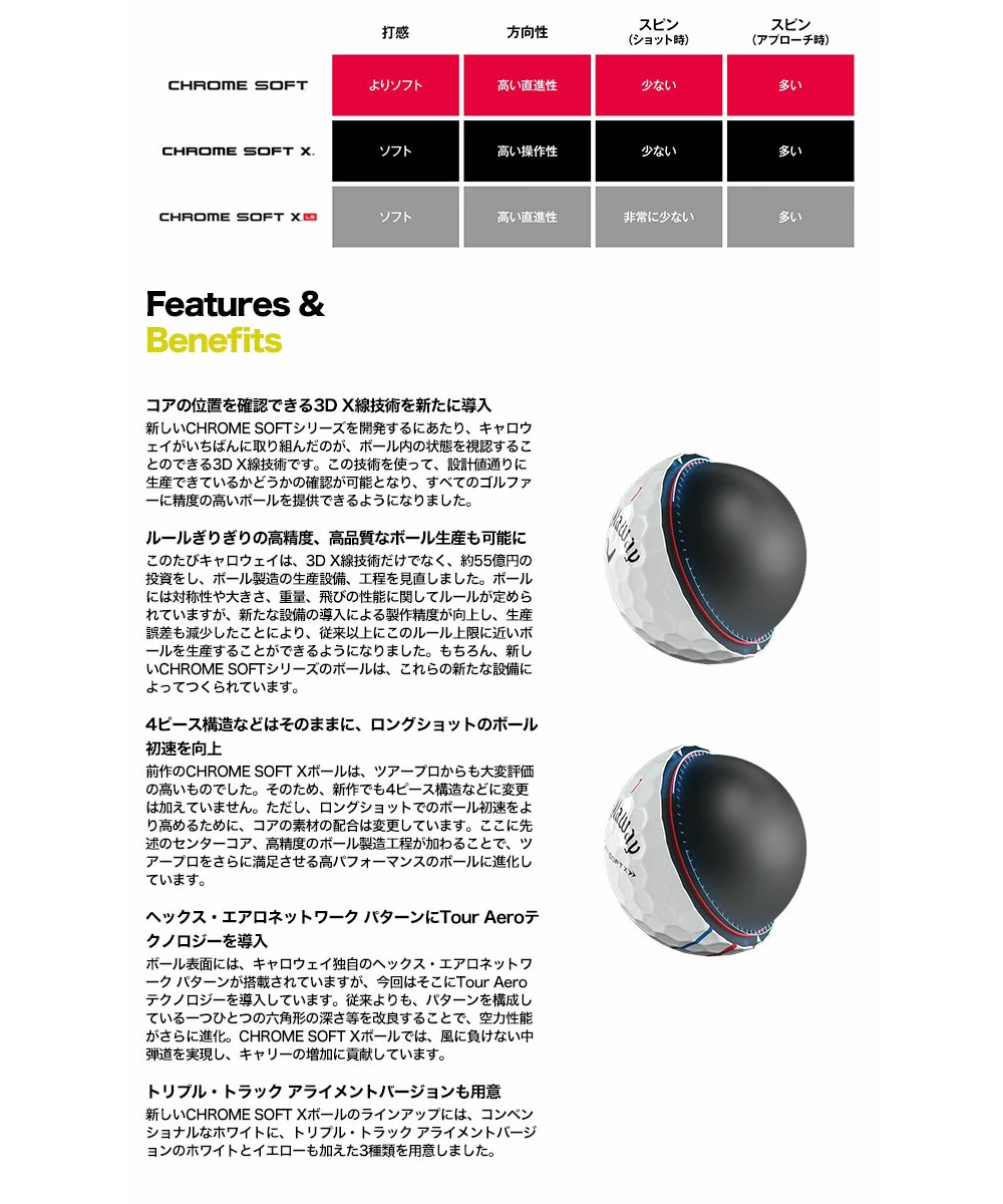 プロから絶大なる信頼を得ているCHROME SOFT Xボールにおいては、新作でもキープコンセプトとしつつ、コアの素材配合を見直し、新たな生産技術を用いることで、ドライバーなどでのボール初速を向上。