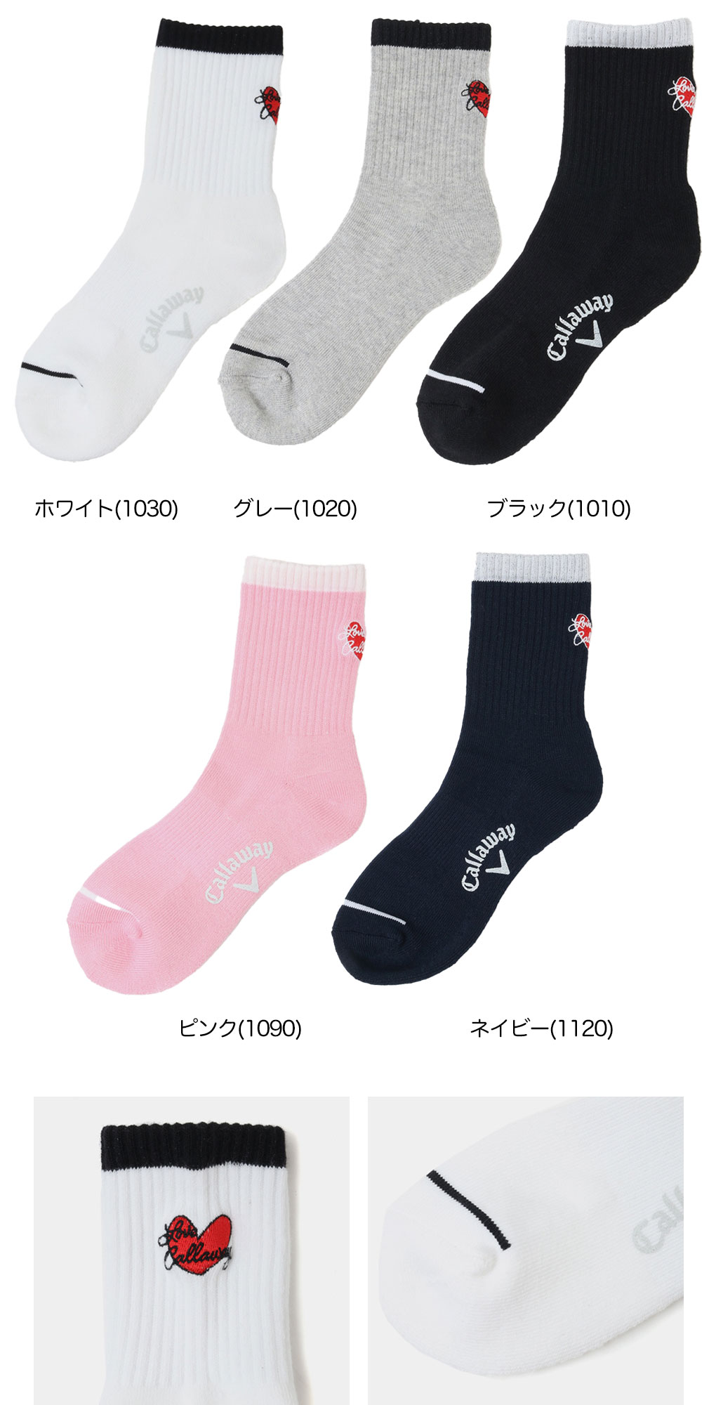 Love Callawayのハートモチーフ刺繍が特徴のリブ仕様ショートソックス。抗菌防臭性のポリエステル・綿混の糸を使用し、吸汗速乾性に優れたアイテムです。足を優しく包み込む程よいフィット感を持った足底サポートと足底パイルなど、機能的なディテールで快適性を向上した履き心地の良いソックスに仕上がっています。