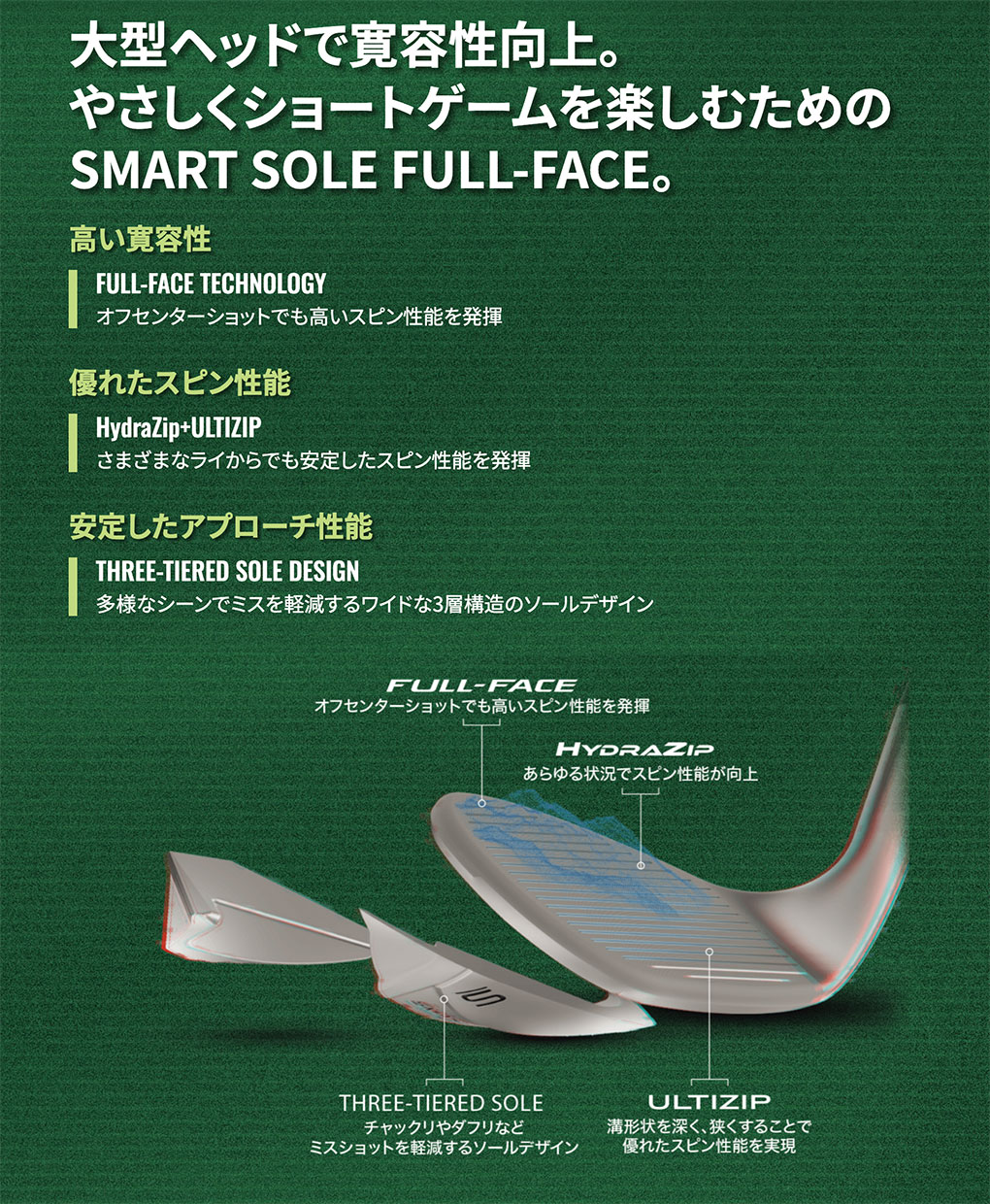 大型ヘッドで寛容性向上。やさしくショートゲームを楽しむためのSMART SOLE FULL-FACE。