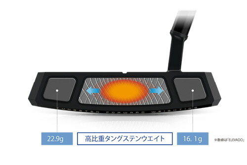 フェースのトウ・ヒールに重量物を配置することで打点ミスに強く、直進性の高い安定したパッティングを実現しています。