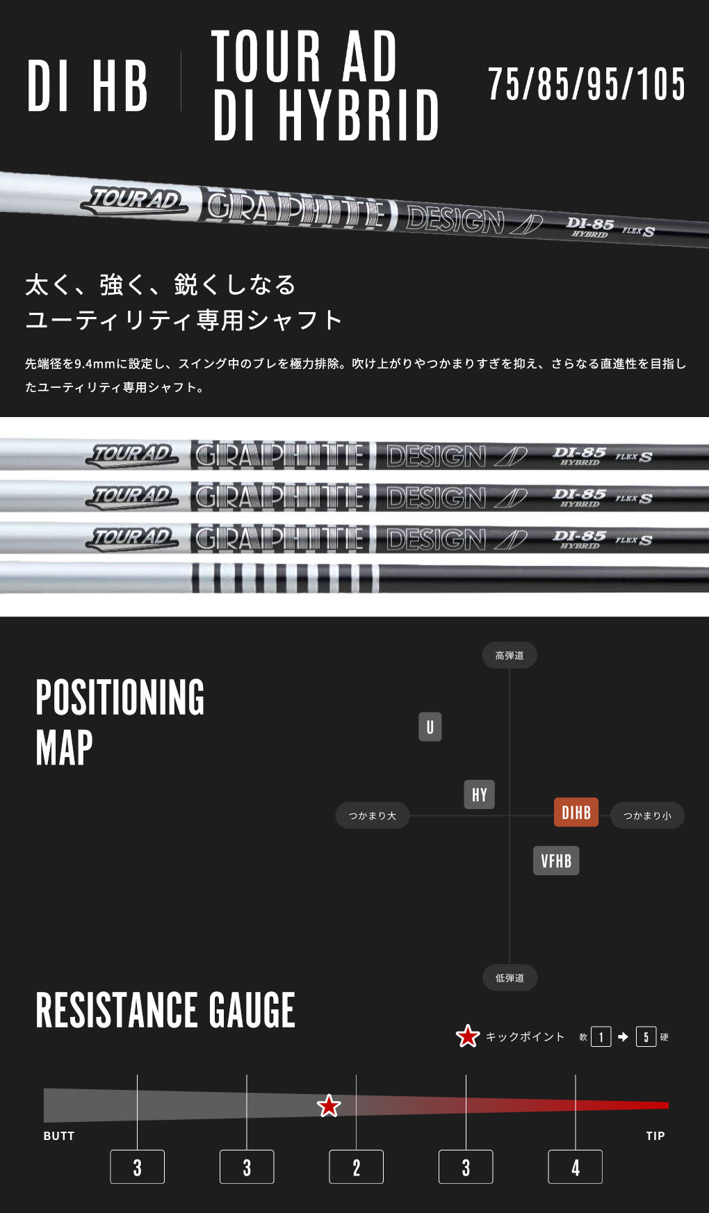 先端径を9.4mmに設定し、スイング中のブレを極力排除。吹け上がりやつかまりすぎを抑え、さらなる直進性を目指したユーティリティ専用シャフト。