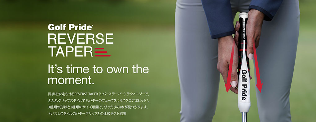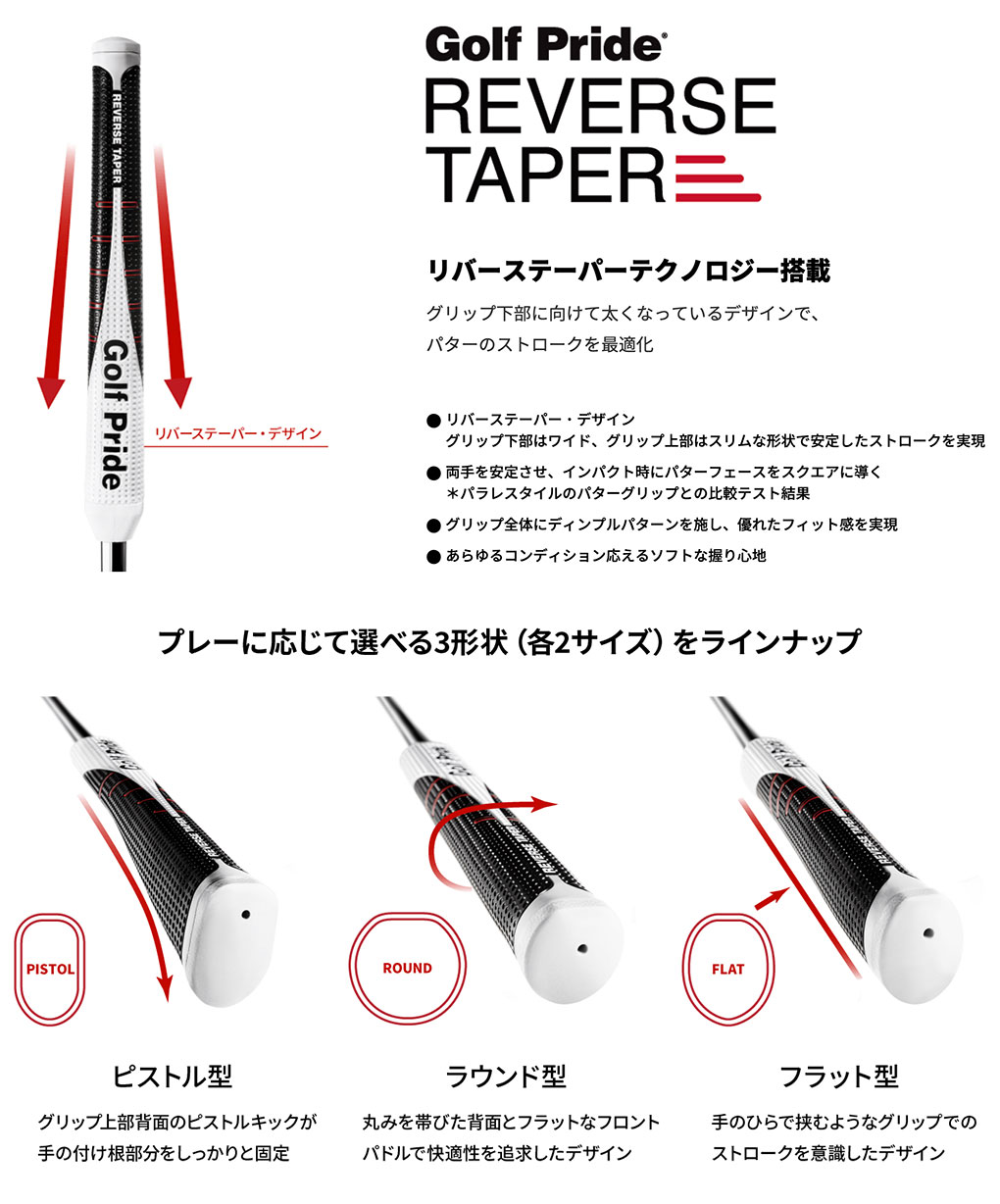 REVERSE TAPER(リバーステーパー)パターグリップシリーズは、グリップ下部をワイド、グリップ上部はスリムに設計された革新的なリバーステーパー・デザインで、パターのストロークを最適化し、高いコントロール性能を実現します。両手の握りを最適化し、パターのフェースをよりスクエアにヒットすることが可能です*。様々なグリップスタイルやプレーに応じて選べる3形状をラインナップしています。