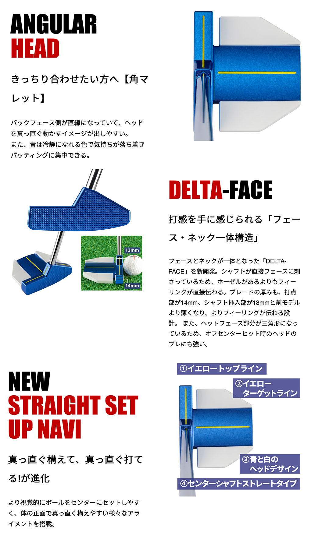 フェースとネックが一体となった「DELTA-FACE」を新開発。シャフトが直接フェースに刺さっているため、ホーゼルがあるよりもフィーリングが直接伝わる。ブレードの厚みも、打点部が14mm、シャフト挿入部が13mmと前モデルより薄くなり、よりフィーリングが伝わる設計。 また、ヘッドフェース部分が三角形になっているため、オフセンターヒット時のヘッドのブレにも強い。