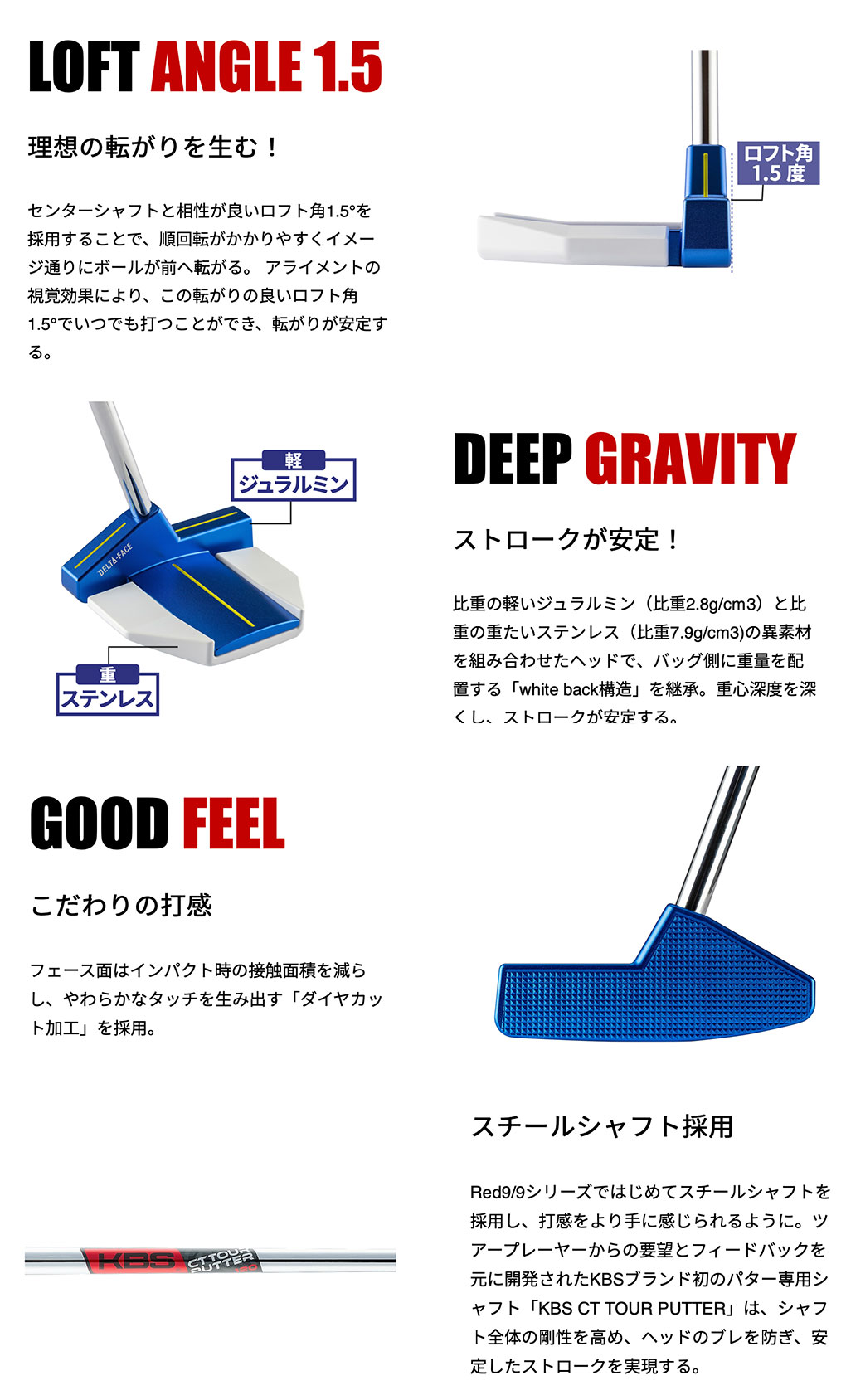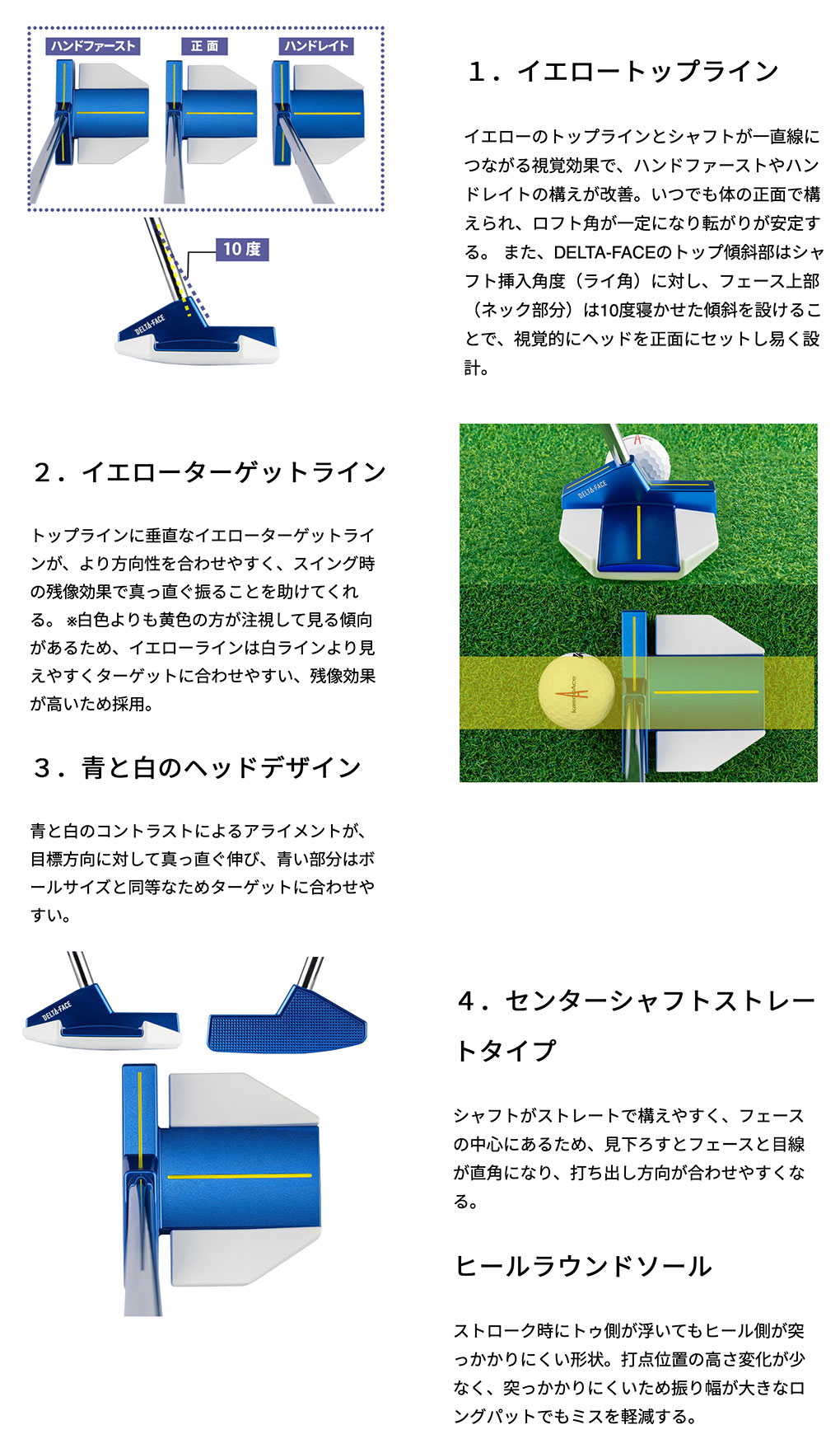 センターシャフトと相性が良いロフト角1.5°を採用することで、順回転がかかりやすくイメージ通りにボールが前へ転がる。 アライメントの視覚効果により、この転がりの良いロフト角1.5°でいつでも打つことができ、転がりが安定する。