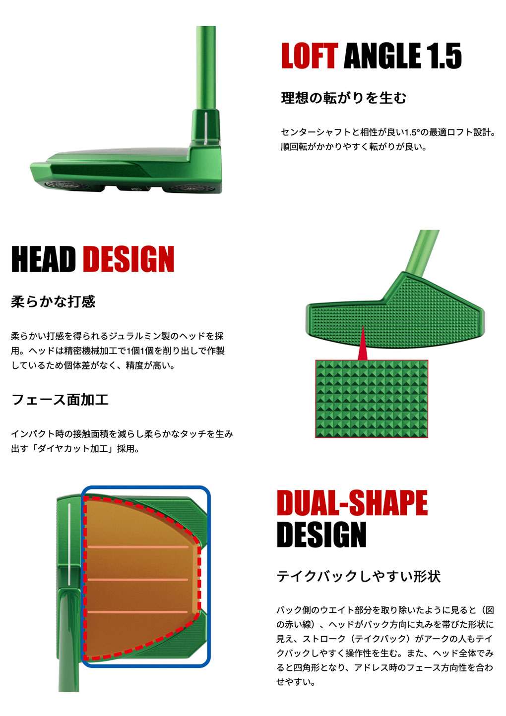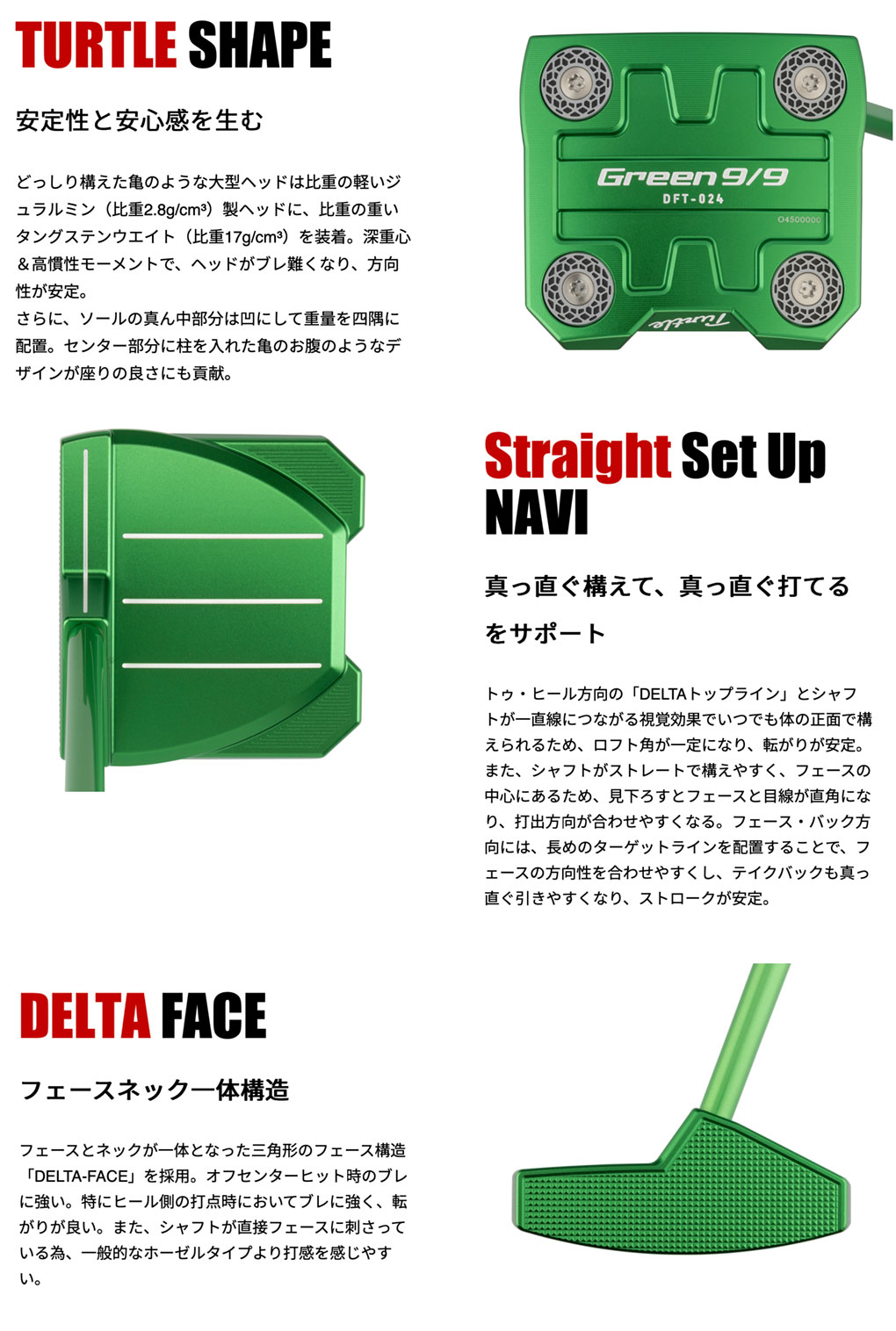 フェースとネックが一体となった三角形のフェース構造「DELTA-FACE」を採用。オフセンターヒット時のブレに強い。特にヒール側の打点時においてブレに強く、転がりが良い。また、シャフトが直接フェースに刺さっている為、一般的なホーゼルタイプより打感を感じやすい。