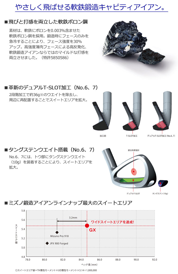 高反発化、軟鉄鍛造ならではのマイルドな打感を両立!さらにミズノ鍛造アイアン最大のスイートエリアでやさしく飛ばす