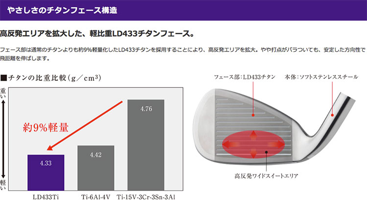 ■フェース部は、通常のチタンよりも約9%軽量化したLD433チタンを採用。ワイドな高反発エリアで、やや打点がバラついても、力強い弾道で飛距離を伸ばします。