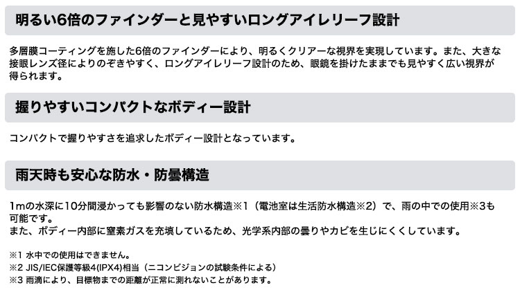 ※3 JIS/IEC保護等級4(IPX4)相当(ニコンビジョンの試験条件による)。すべての条件での無破壊、無故障を保証するものではありません。