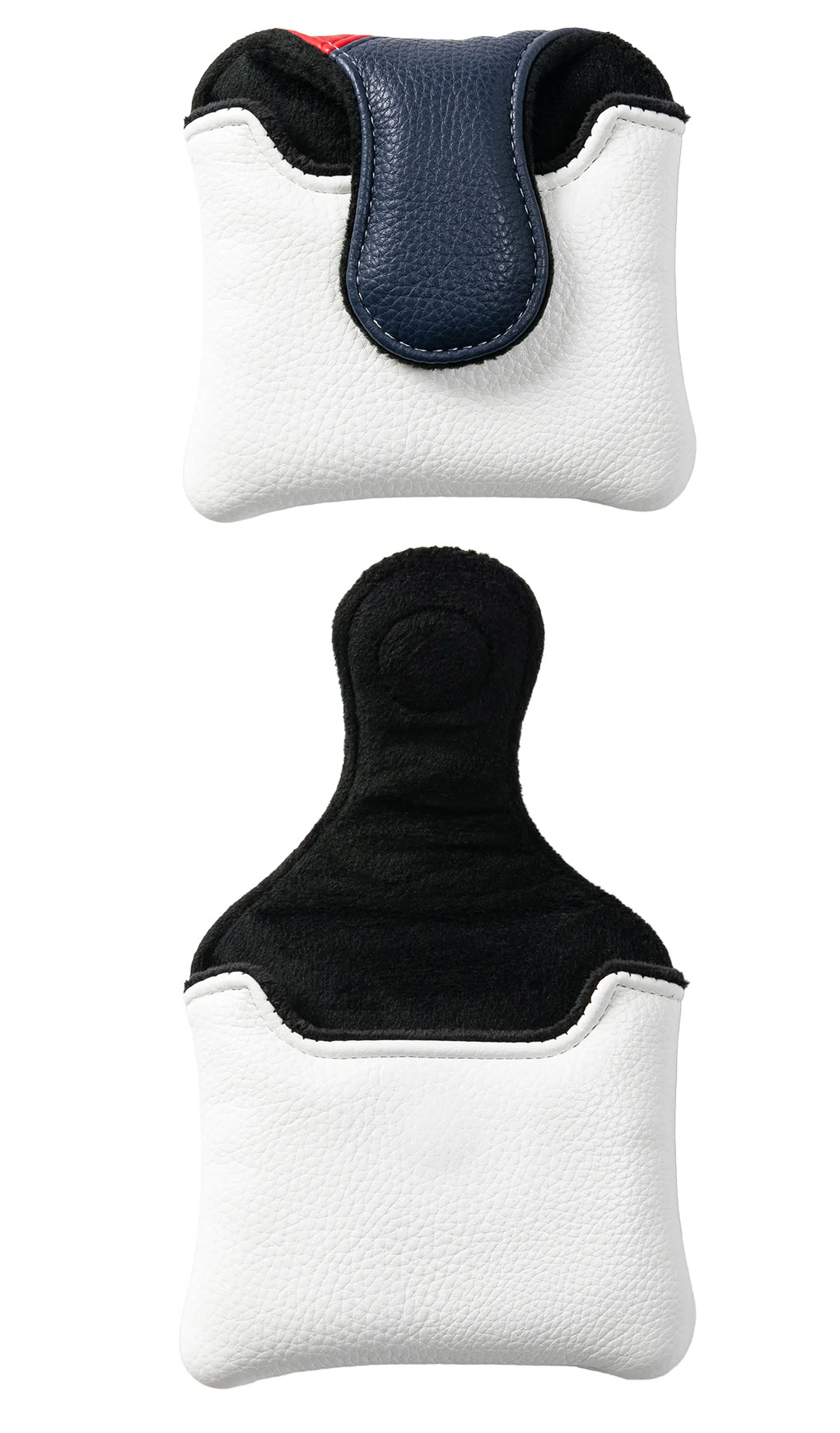 マレットタイプ用パターカバー。高級感のある深めのエンボス合皮を使用し、ゴルフシーンで映えるトリコロールカラーとブラックカラーがあります。ブラックカラーにはホワイトステッチを効かせてアクセントを加えました。