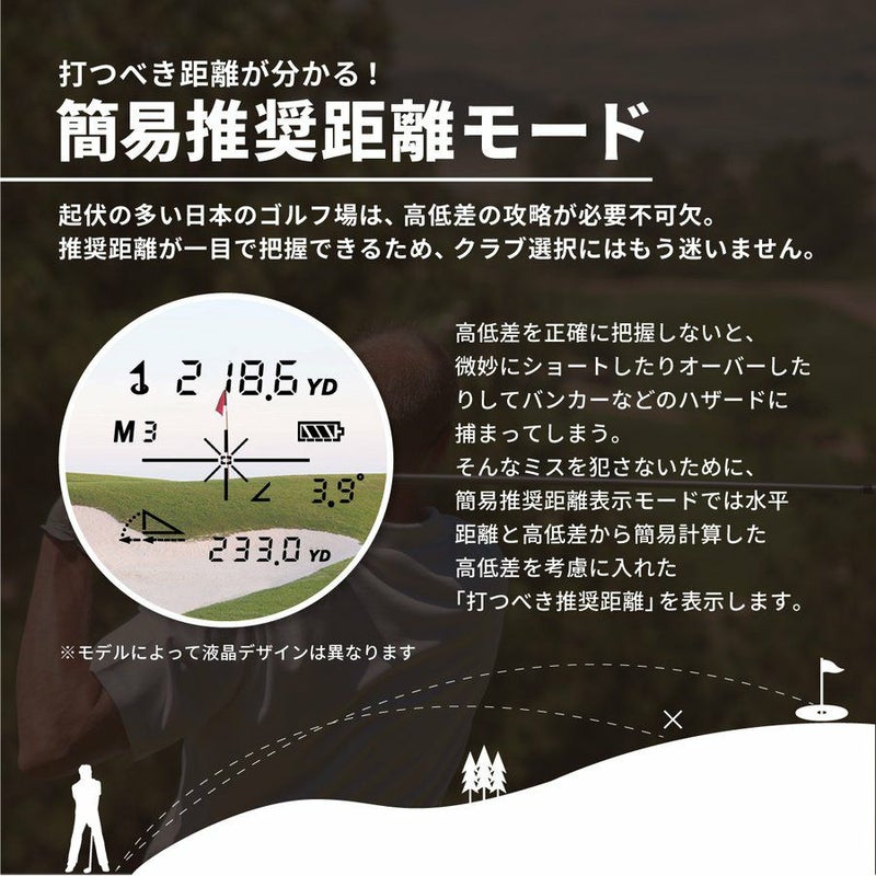■測定単位 : 直線距離・推奨距離0.1ヤードまたはメートル 高低差0.1ヤード単位 角度0.1度単位