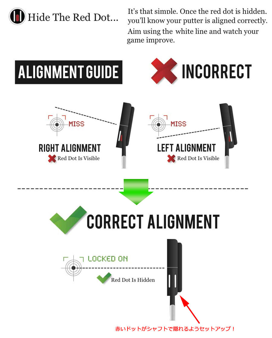 "赤いドット"を隠すようにセットアップするだけで常にスクエアに、安定したポジションで構えることが可能!練習用としても人気なパター!