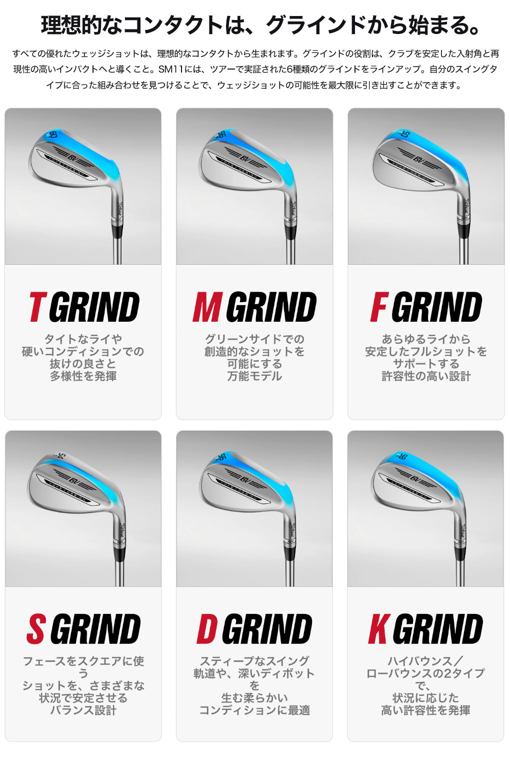 すべてのゴルファーには、グリーンまわりでもっと輝ける力があります。SM11は、その力を引き出します。あらゆるプレースタイルに対応する多彩なグラインドと、スピンをより最適にコントロールする新開発のボーケイ・スピンシステム。SM11は思い描いたショットを打ちきるためのクラブであると同時に、ショートゲームへの自信をもたらします。