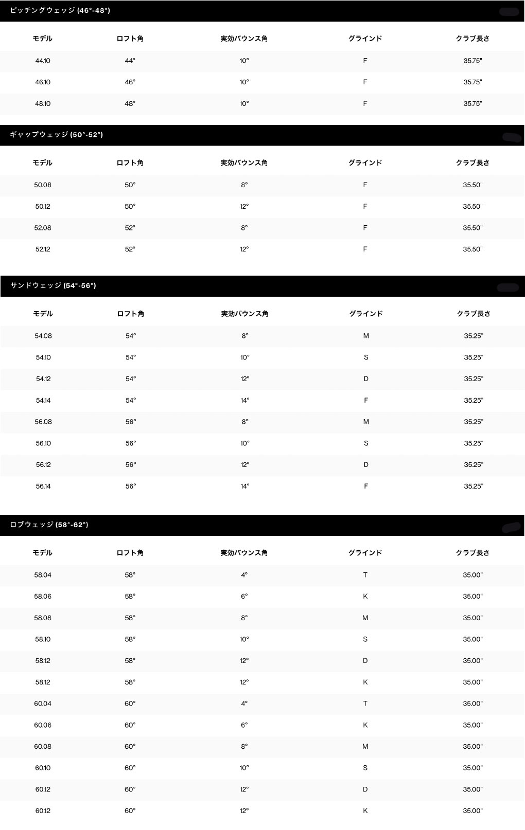 上記の標準の長さからレディースは -1インチ、ジュニアは -2インチ短い設定です。