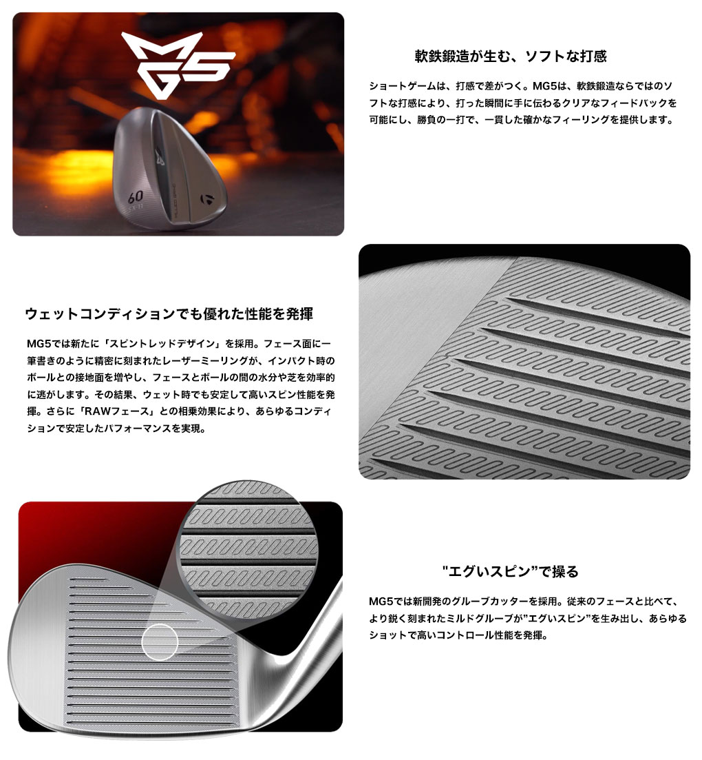 MG5では新たに「スピントレッドデザイン」を採用。フェース面に一筆書きのように精密に刻まれたレーザーミーリングが、インパクト時のボールとの接地面を増やし、フェースとボールの間の水分や芝を効率的に逃がします。その結果、ウェット時でも安定して高いスピン性能を発揮。さらに「RAWフェース」との相乗効果により、あらゆるコンディションで安定したパフォーマンスを実現。