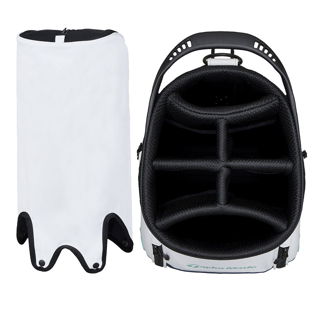 バイカラーデザインが印象的なスタイリッシュモデル。テーラーメードアパレルとリンクしたデザインとスリムなバッグ形状により、従来のテーラーメードバッグには無かったデザイン性とスタイリッシュさを感じられるモデル。ハンドル式口枠や立体ロゴ、パンチング加工など、細かい部分にもこだわったモデル。ラウンドが楽しくなるキャディバッグ。