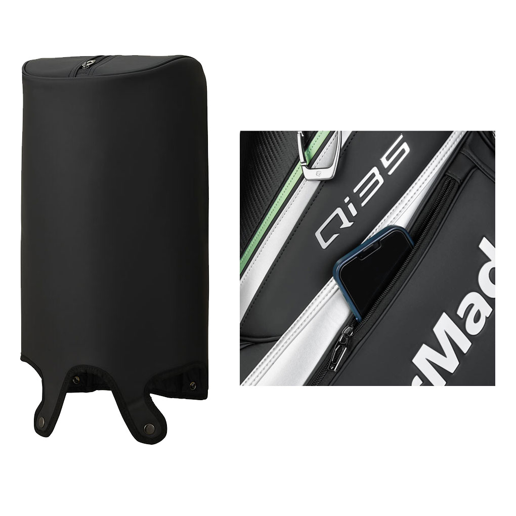 正面・背面双方向から使用可能なトップハンドル、3点式ショルダーベルト、マグネット開閉の正面アクセサリーポケットや両サイドのドリンクポケット、サイドパネルにはプロダクトロゴと成型モールドパーツを配し、背面にはTEAM TAYLORMADEロゴをあしらったプロ仕様バッグ。