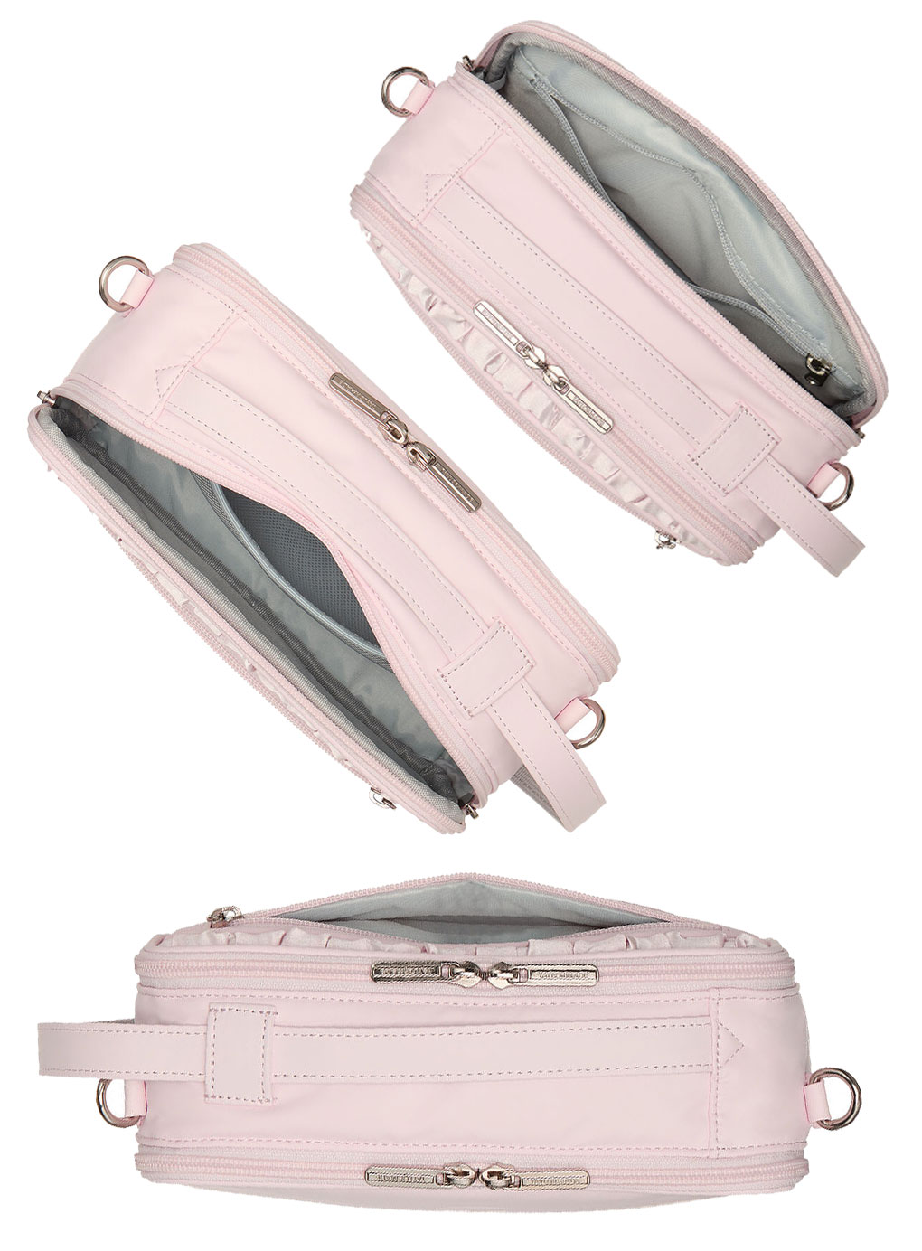 シャーリングデザインが特徴的な上品さとスタイリッシュさを持つショルダーポーチ。トップにシャーリングデザインを大胆に配置し、フェミニンな印象を表現しながら、高級感のある合成皮革を使用し、ロゴをシンプルに仕上げることにより上品かつスタイリッシュさを感じられるレディスモデル。ショルダーベルトによる斜め掛けと、ハンドルを2か所にすることでタテでもヨコでも持つことができます。収納部分が2室に分かれているのでラウンド用品を整理して収納可能。ゴルフだけでなく、トラベルシーンなどでも使えるアイテムです。