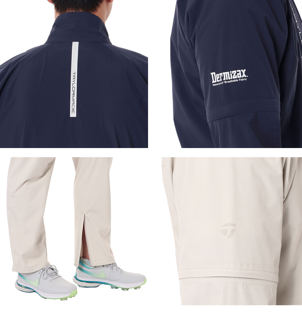 高いレベルでバランスする耐水圧と透湿性を併せ持ち、軽量でメカニカルストレッチ性を持つ東レの『ダーミザックス』素材を採用したレインスーツです。プレイヤーとの対話を重ね、袖の取り外し機能などレインウェアとしての必須な部分はキープしながら、可能な限りシンプルなデザインとすることで、レインシーン以外での着用も想定しています。