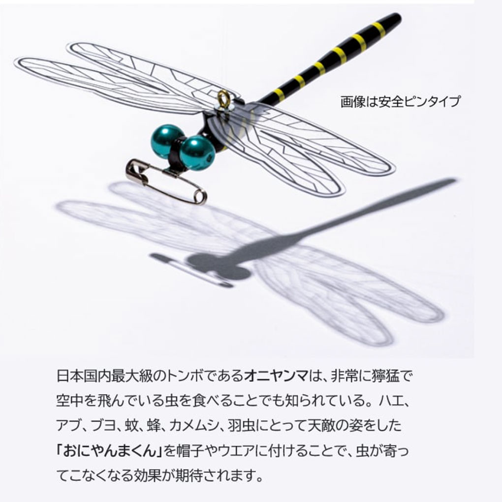 日本国内最大級のトンボであるオニヤンマは、非常に獰猛で空中を飛んでいる虫を食べることでも知られている。 ハエ、アブ、ブヨ、蚊、蜂、カメムシ、羽虫にとって天敵の姿をした「おにやんまくん」を帽子やウエアに付けることで、虫が寄ってこなくなる効果が期待されます。