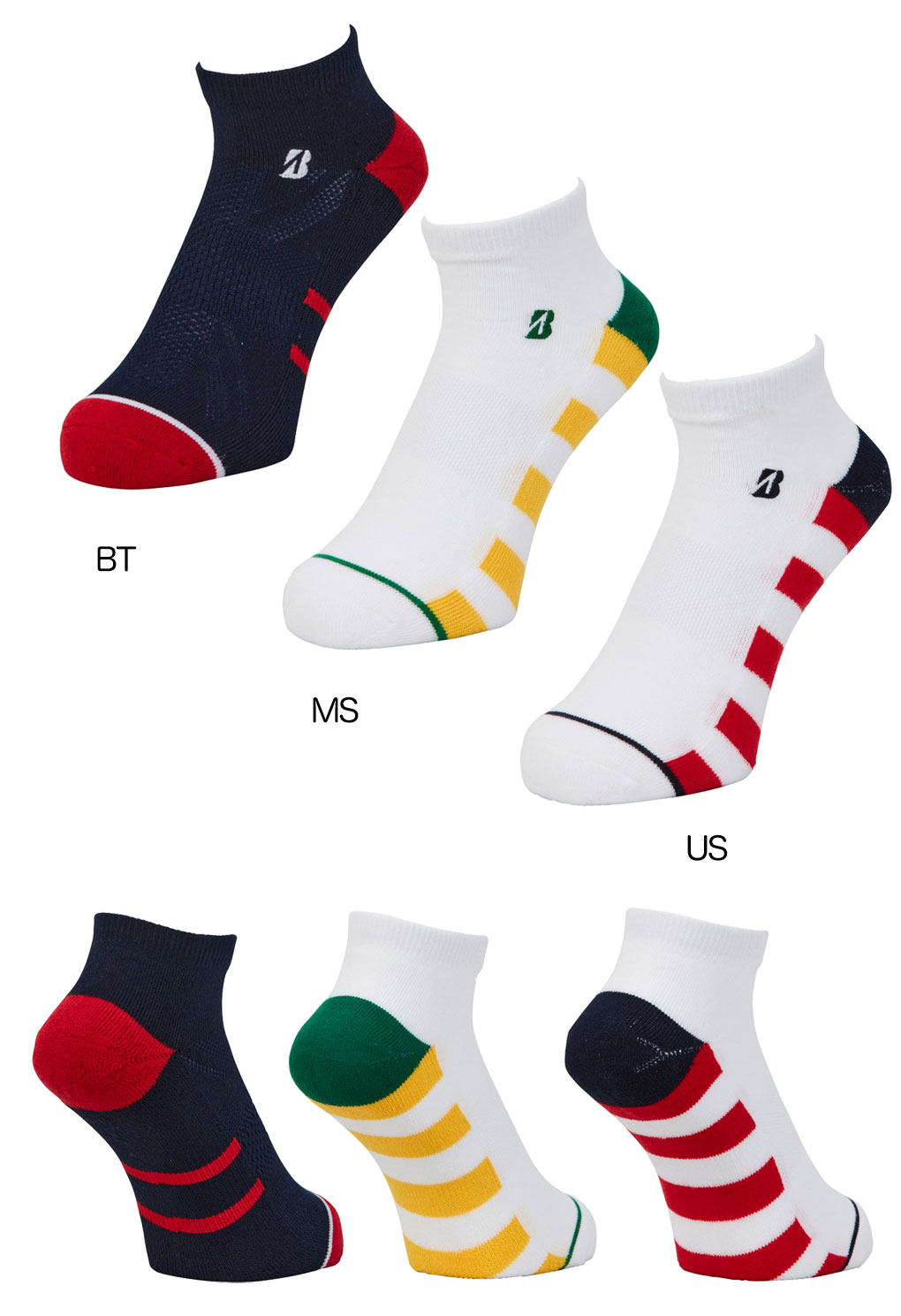 メジャートーナメントをイメージしたソックス。甲部分には★柄(US・MS)、ユニオンジャック(BT)をモチーフにしたメッシュが入っています。シューズを脱いだ後も楽しめるデザインソックスになっています。