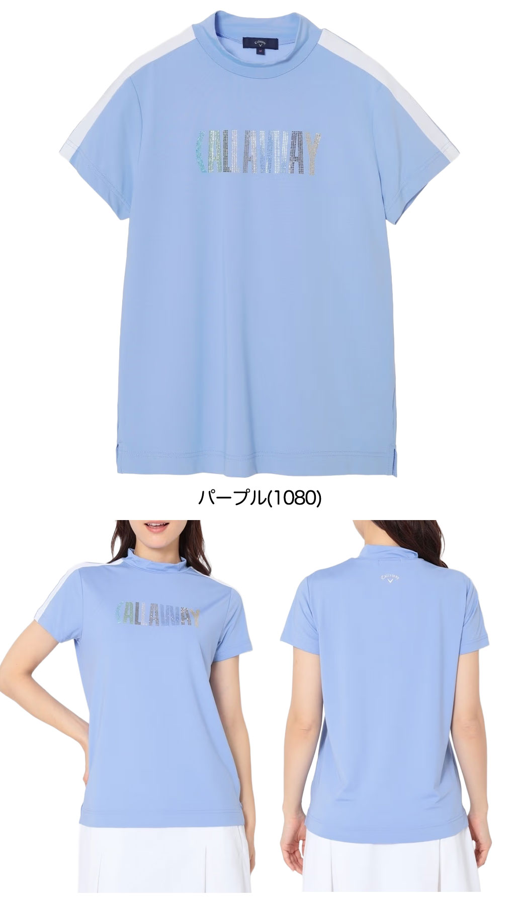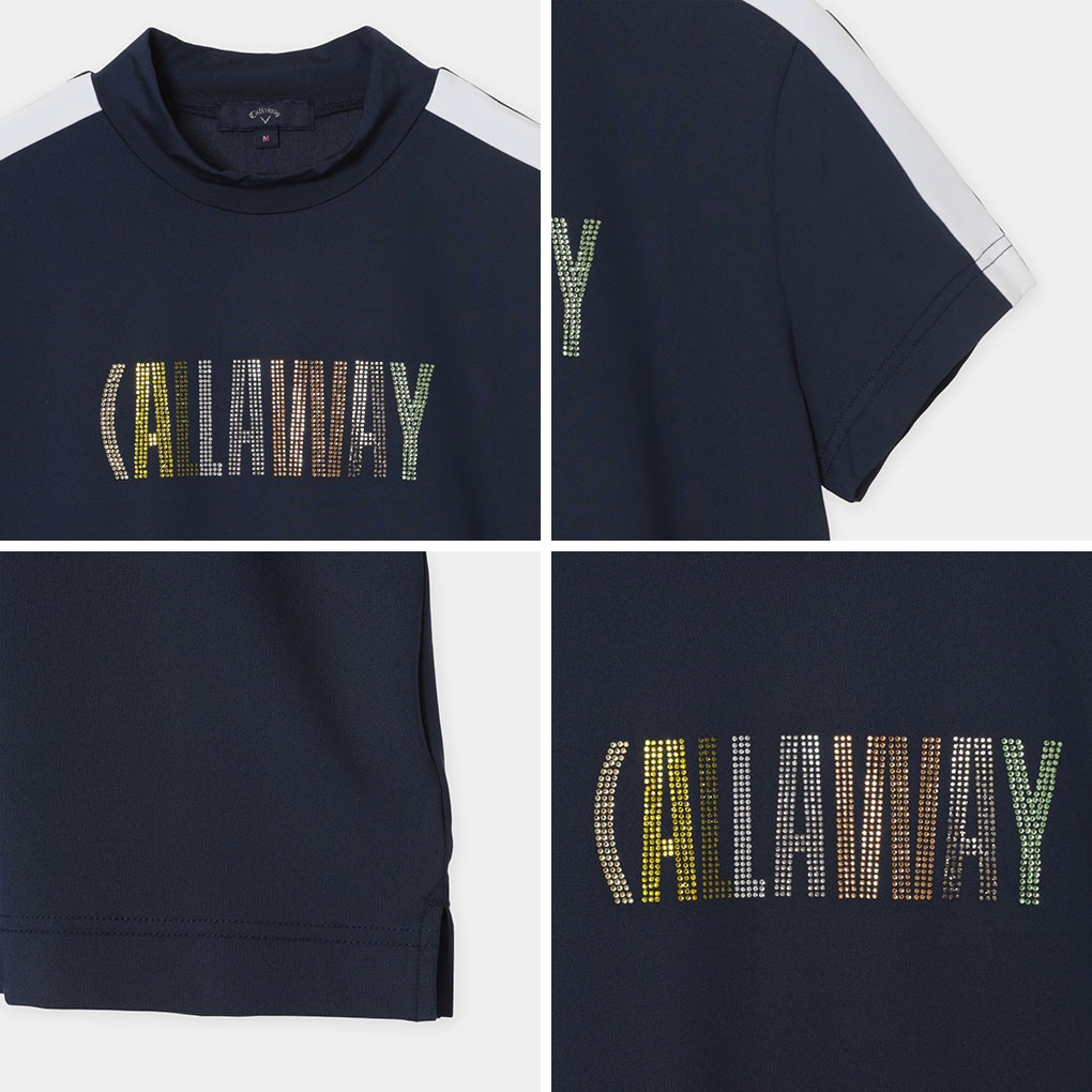 ストレッチ性の高いポリエステルスムース素材を使用したキャロウェイ定番のアイテムで、フロントにはCALLAWAYロゴをラインストーンのグラデーションで表現した存在感のあるアートワークを配置し、肩の配色ラインが持つスポーティーさとラインストーンのフェミニンな印象のミスマッチが今らしい、スペシャル感のある一着です。