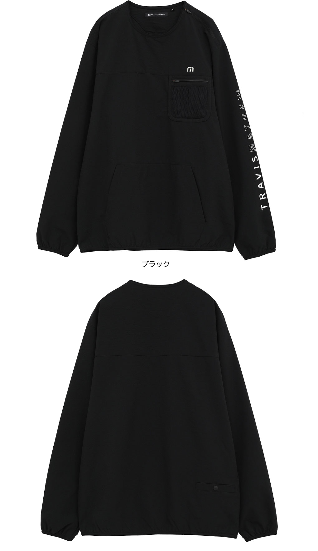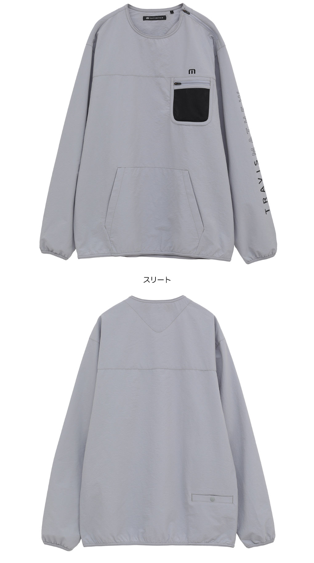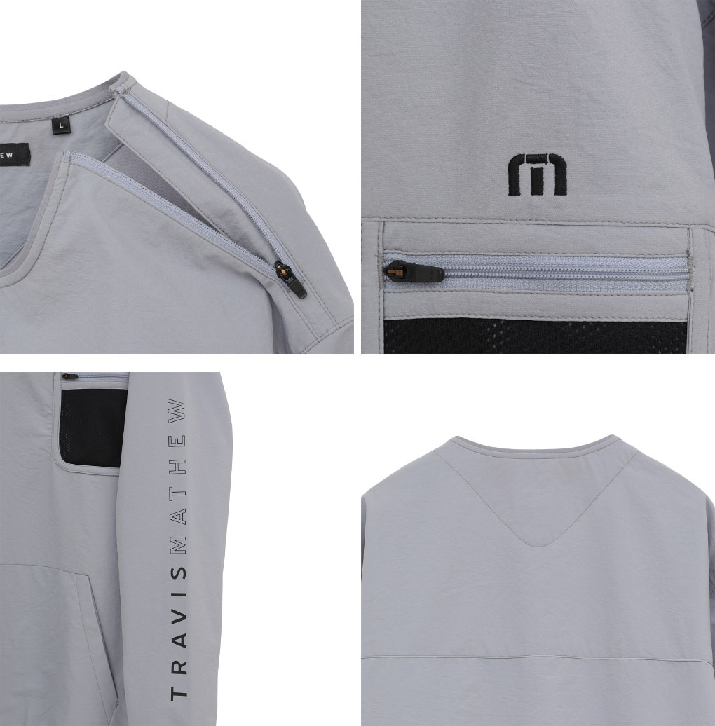 ワークテイストなメッシュポケットがトレンド感あるスニードジャケット。特殊な織り構造のエコ素材を使用し、シワ加工でナチュラルな風合いに仕上げた軽やかな一着。左袖にはスタイリッシュなTRAVISMATHEWロゴをプラス。左肩ファスナーで着脱しやすく撥水加工を施した機能性の高さも魅力です。ラウンド時や屋外練習、レジャーにも適した使い勝手の良いアイテムです。