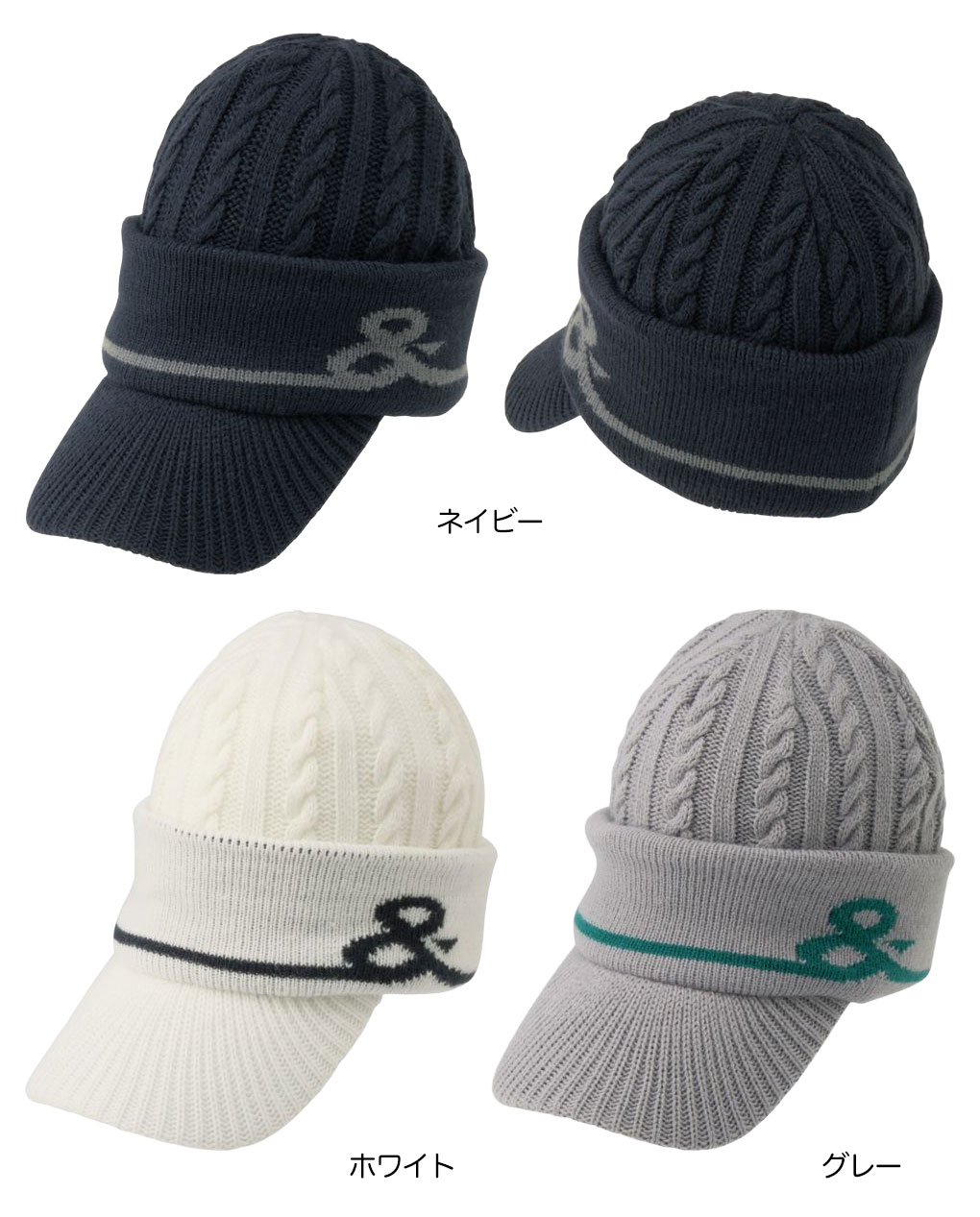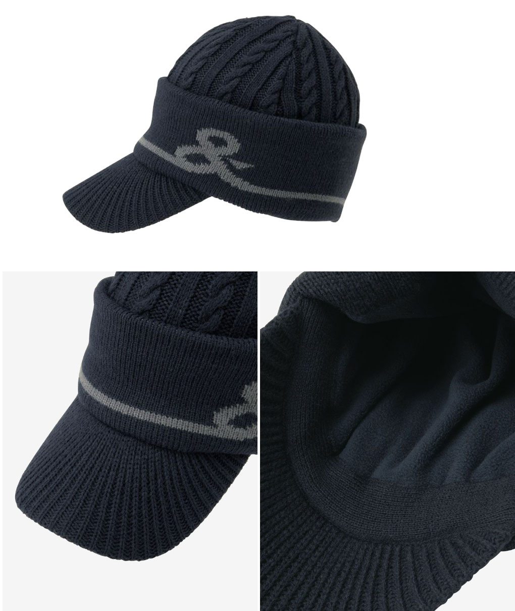 肌触りが良く保温性の高いアクリル繊維のケーブル編みニットを使用した、つば付きニットキャップです。内側は温もりのあるソフトタッチなフリース生地を使用しています。リブをずらすと耳回りと首回りを保温してくれるデザイン。 頭部を優しく包み込み、冷たい空気や風からしっかり防寒してくれる冬のゴルフシーンに欠かせない防寒アイテムです。UVケア(UPF15~30、紫外線カット率85%以上)機能付きです。ゴルフはもちろん、キャンプなどのアウトドアやタウンユースまで幅広く活用できます。