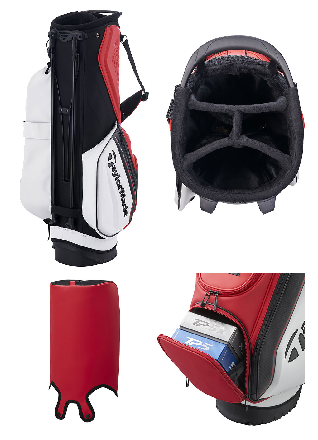 サイドパネル上部にはSTEALTHロゴとカーボンフェースを模したモールドパネルを配し、正面にはTEAM TAYLORMADEロゴをあしらい、ドリンクポケット等を搭載したプロ仕様のしたスタンドバッグ。