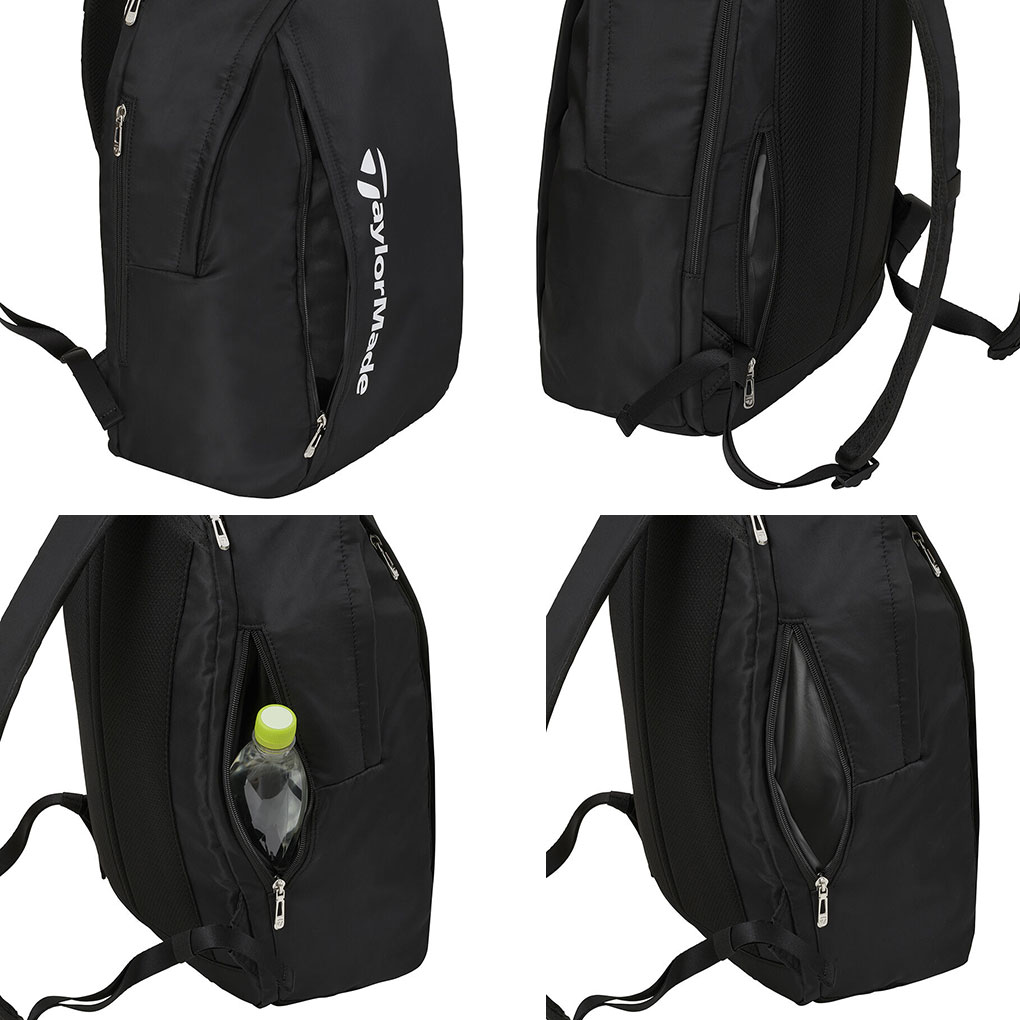 テーラーメイドロゴが印象的な機能的なバックパック。開口部は大きく開くのでアパレルやシューズをしっかり収納可能。背中側にはラップトップPCを保護する独立したPC収納ポケット。またメインエリア外側にも小物などを収納できるポケットや、ボトルや折り畳み傘用のサイドポケット、腰部に近い場所にキーなどが取り出しやすいミニポケットなど、タウンでも活躍する機能的なバックパック。