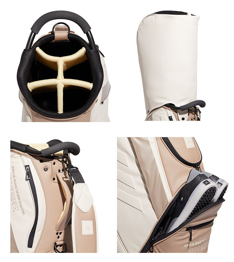 持ち運びに便利なアルミハンドルやシューズインポケットを装備するなど、スタイリッシュな中にもゴルフシーンで欠かせない機能にもこだわったキャディバッグ。